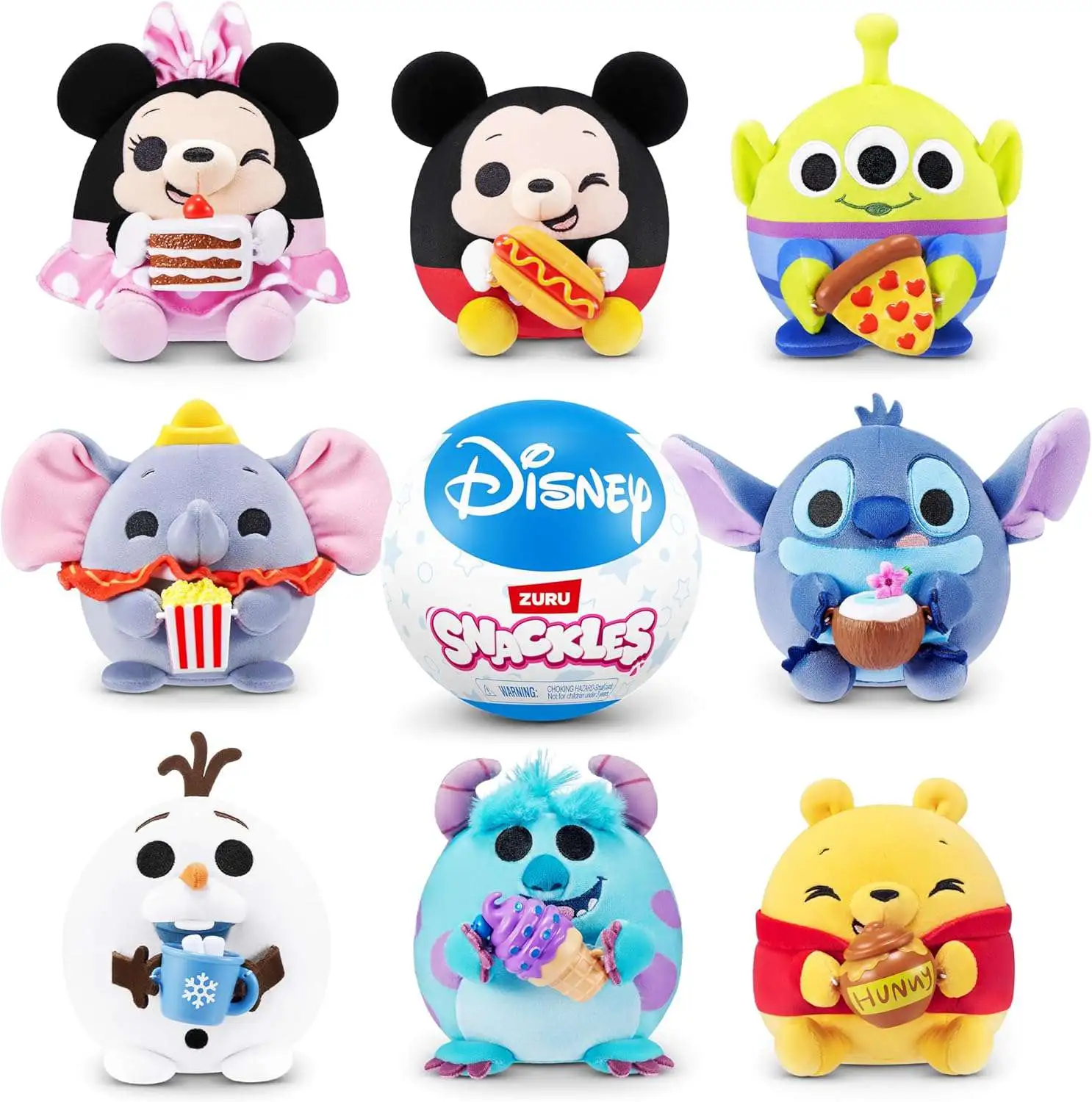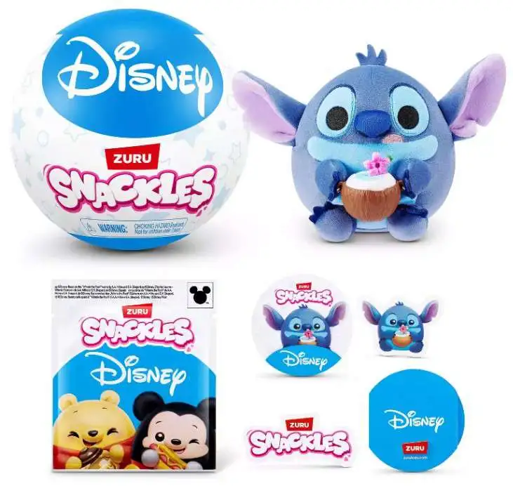 - Each Mystery Pack includes one randomly selected, ultra-soft 5-inch Disney Snackles plush featuring beloved characters like Mickey, Stitch, Pooh, Dumbo, and more.