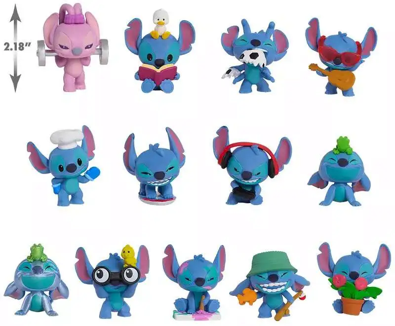 - 13 to Collect: Look for Stitch gaming, painting, baking, bird-watching reading, surfing, gardening, doing yoga, playing soccer, fishing, or playing guitar; and Angel lifting a barbell. There's even a rare Stitch chase figure! Each sold separately.