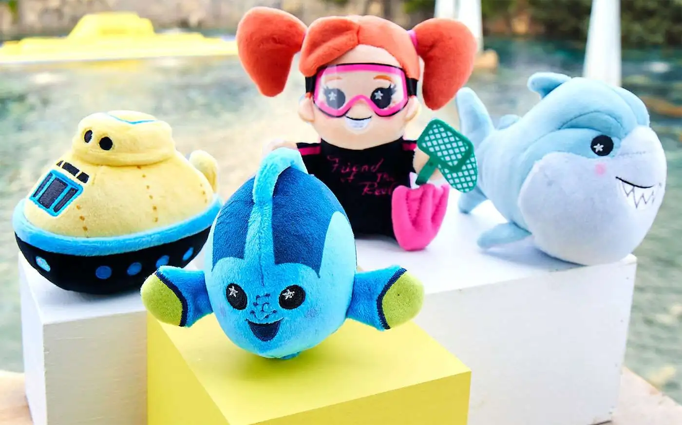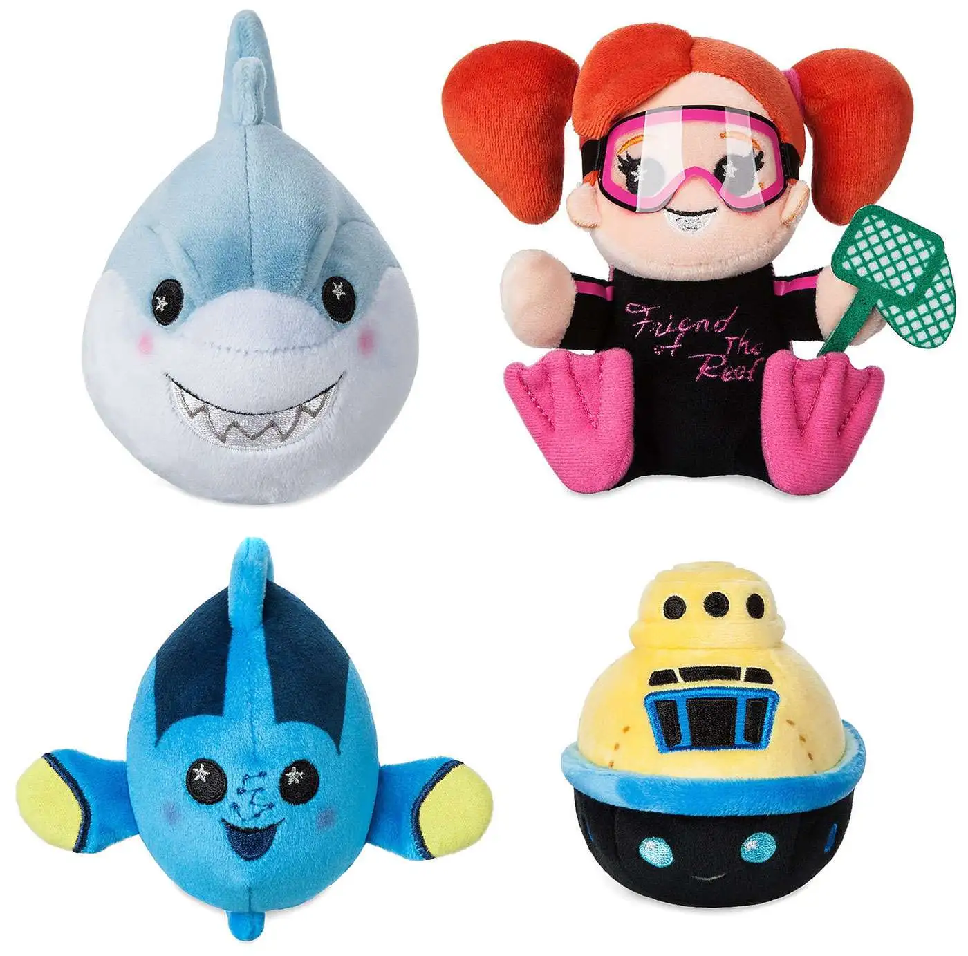 Finding Nemo Submarine Voyage series figures include Dory with with 3D fins; Bruce with 3D fins; N.E.M.O. Submarine with 3D rudder; and Darla with 3D pigtails, felt fish net, plastic goggles, and embroidered details