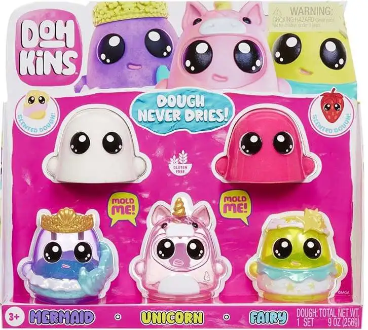 - INCLUDES: 3 DohKins character molds (mermaid, unicorn, and fairy) with removable accessories and 9oz of scented dough.