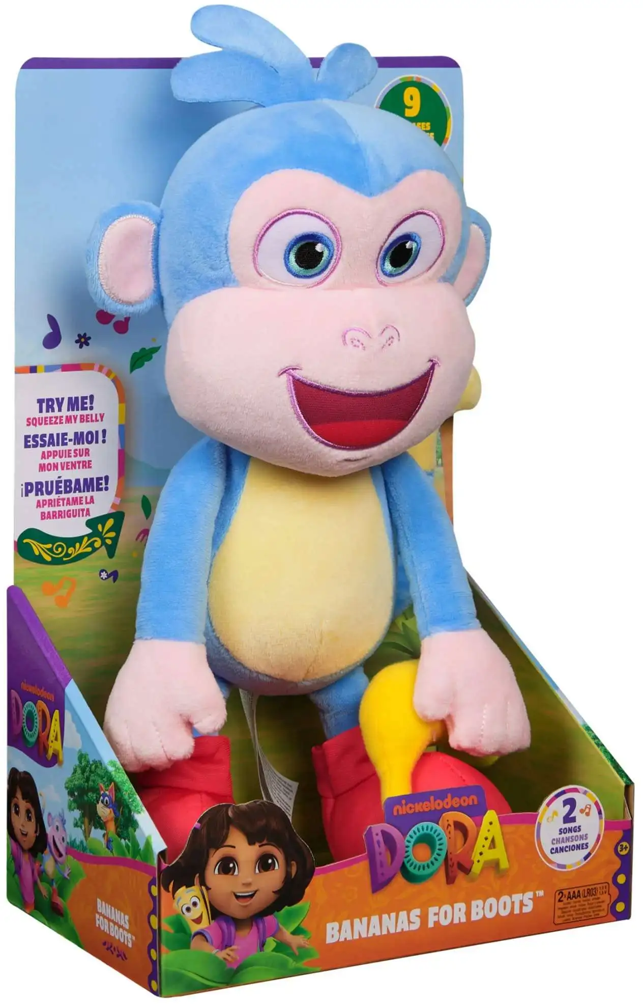 - SINGING PLUSH: Boots is full of surprises that make playtime engaging and entertaining. Press his tummy and he comes to life with 9 banana-riffic phrases and 2 songs from the show, including his and Dora's theme songs!