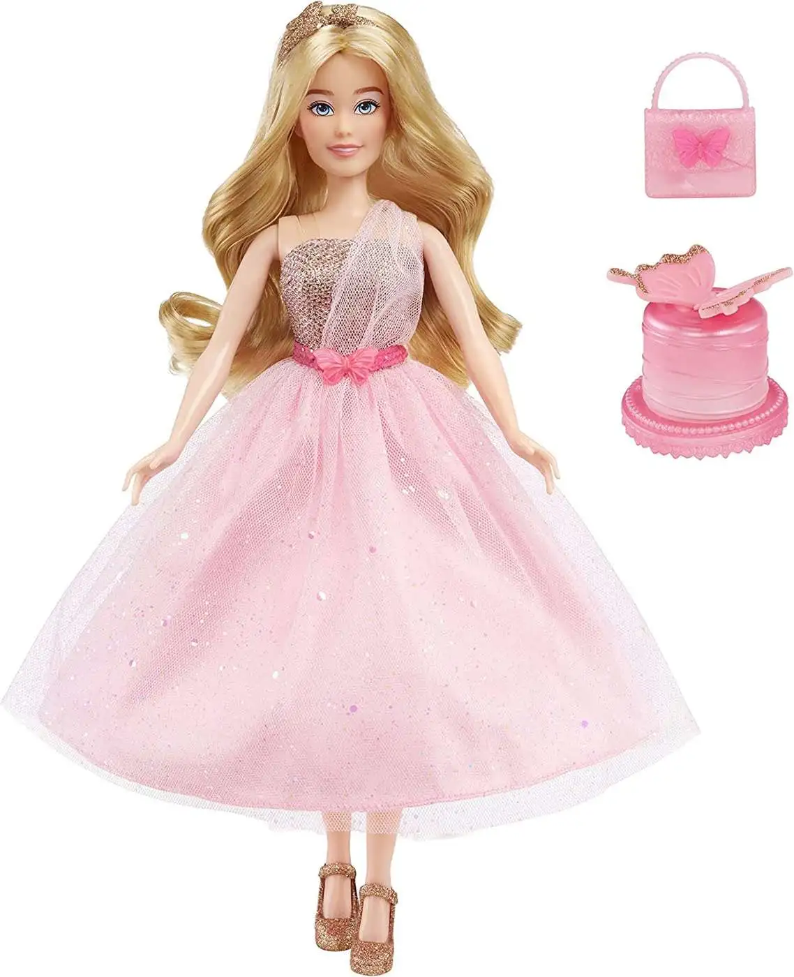 - 5 BUTTERFLY THEMED ACCESSORIES: Have a butterfly dream party! Doll comes with a pink butterfly cake with gold glitter wing detail, gold glitter butterfly headband, pink butterfly belt, pink butterfly purse, and gold glitter heels