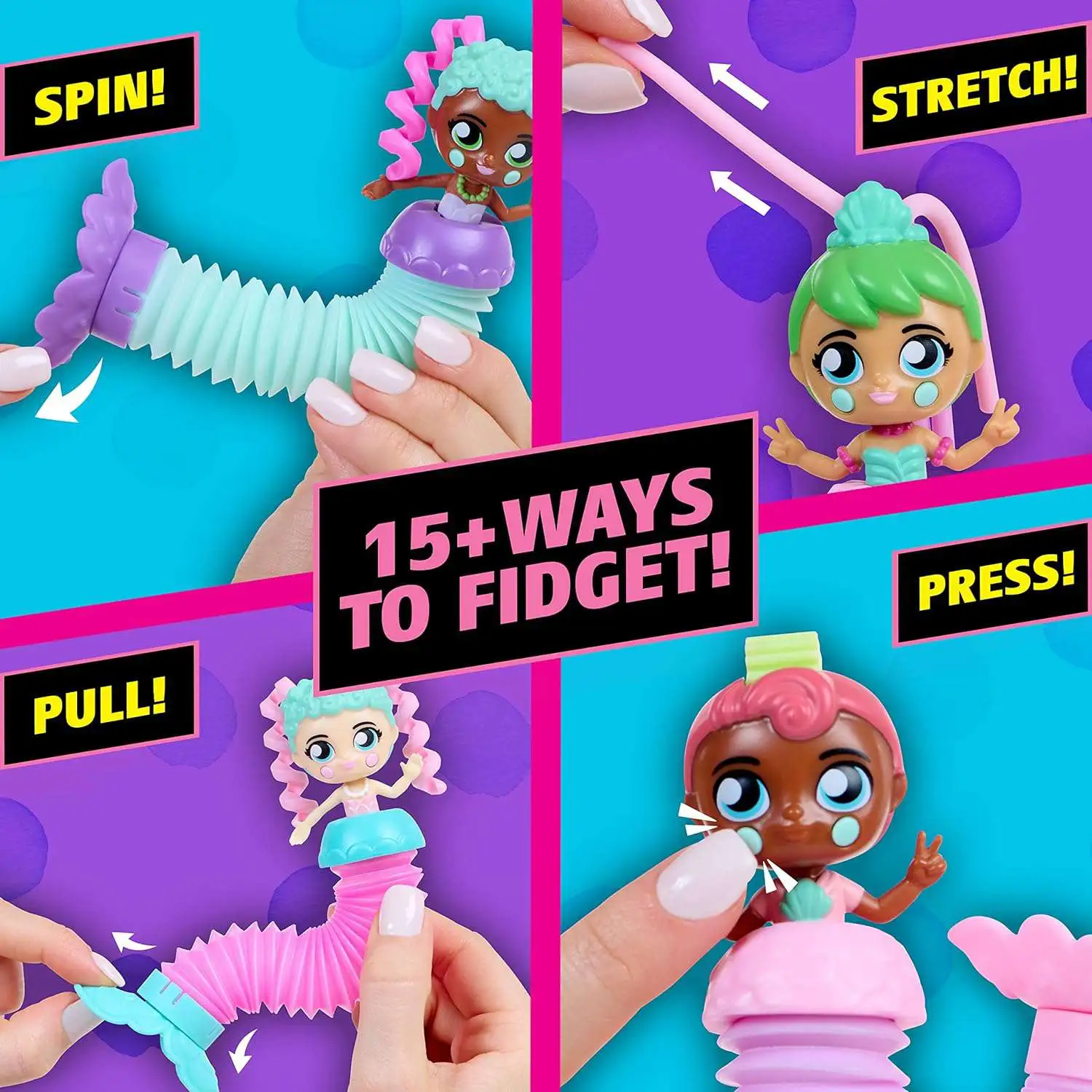 - 15 plus WAYS TO FIDGET IN STYLE: Each Fashion Fidgets Mermaid doll comes with 15 ways to fidget from their cheeks to their hair to their mermaid tails.