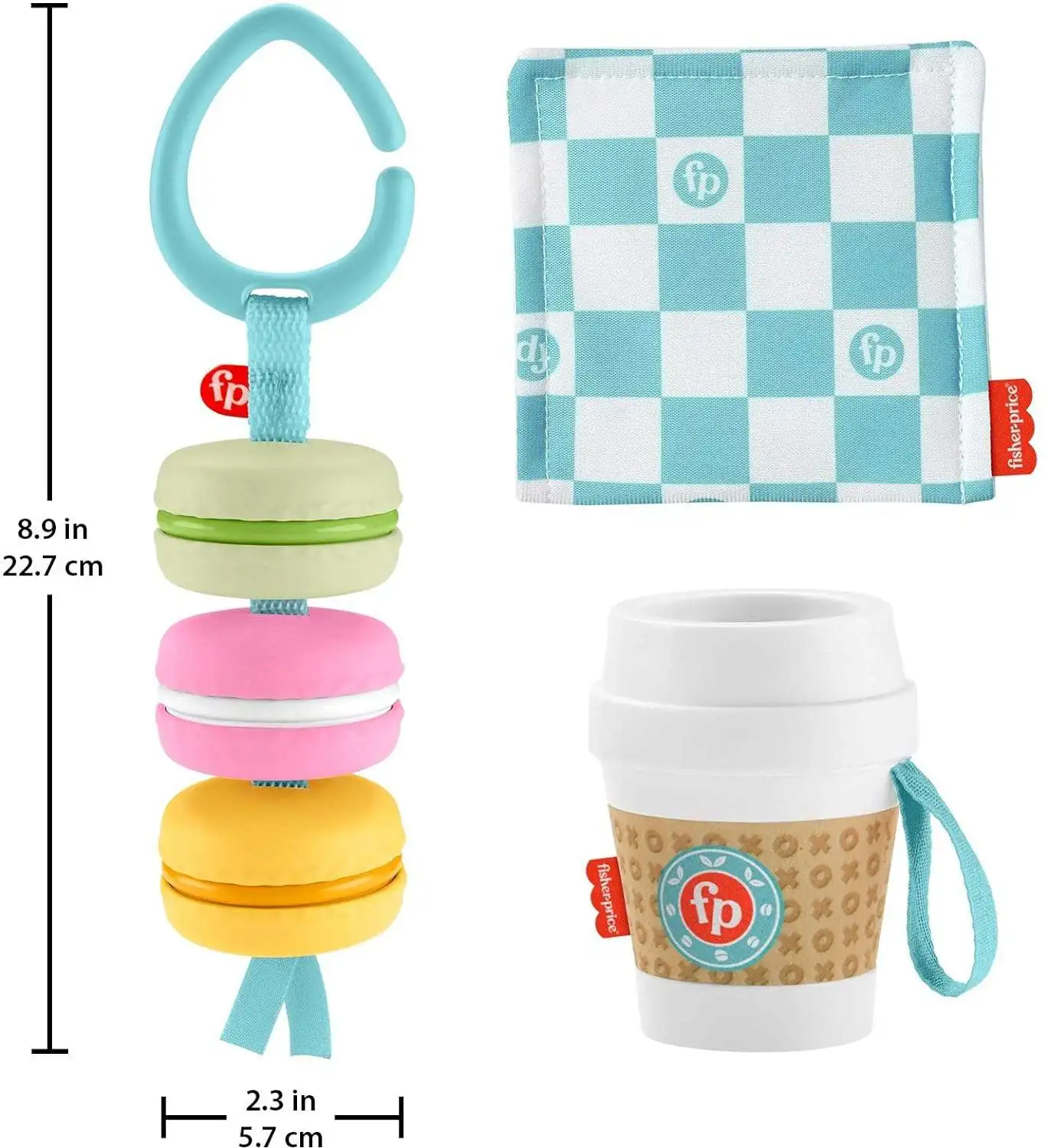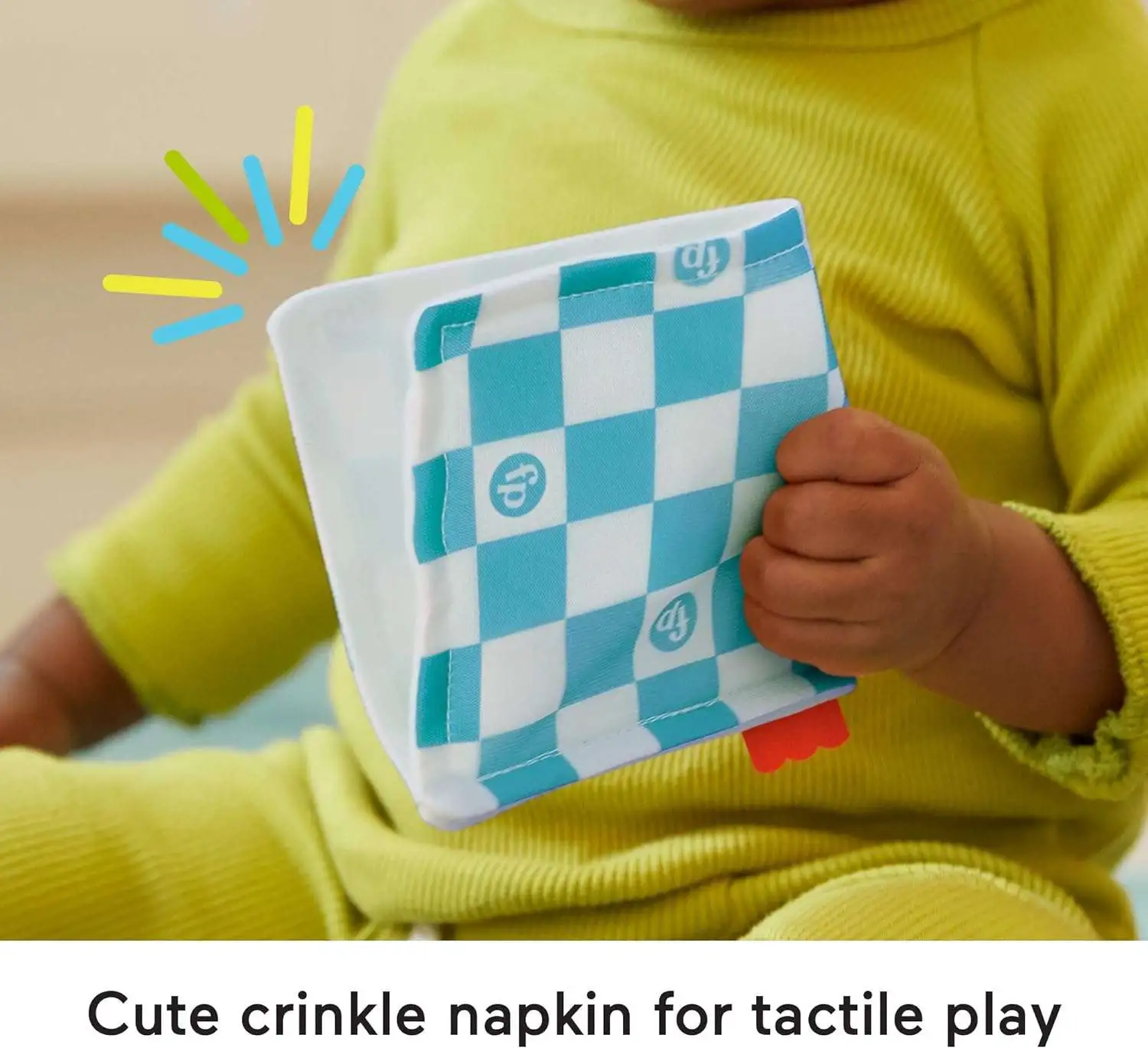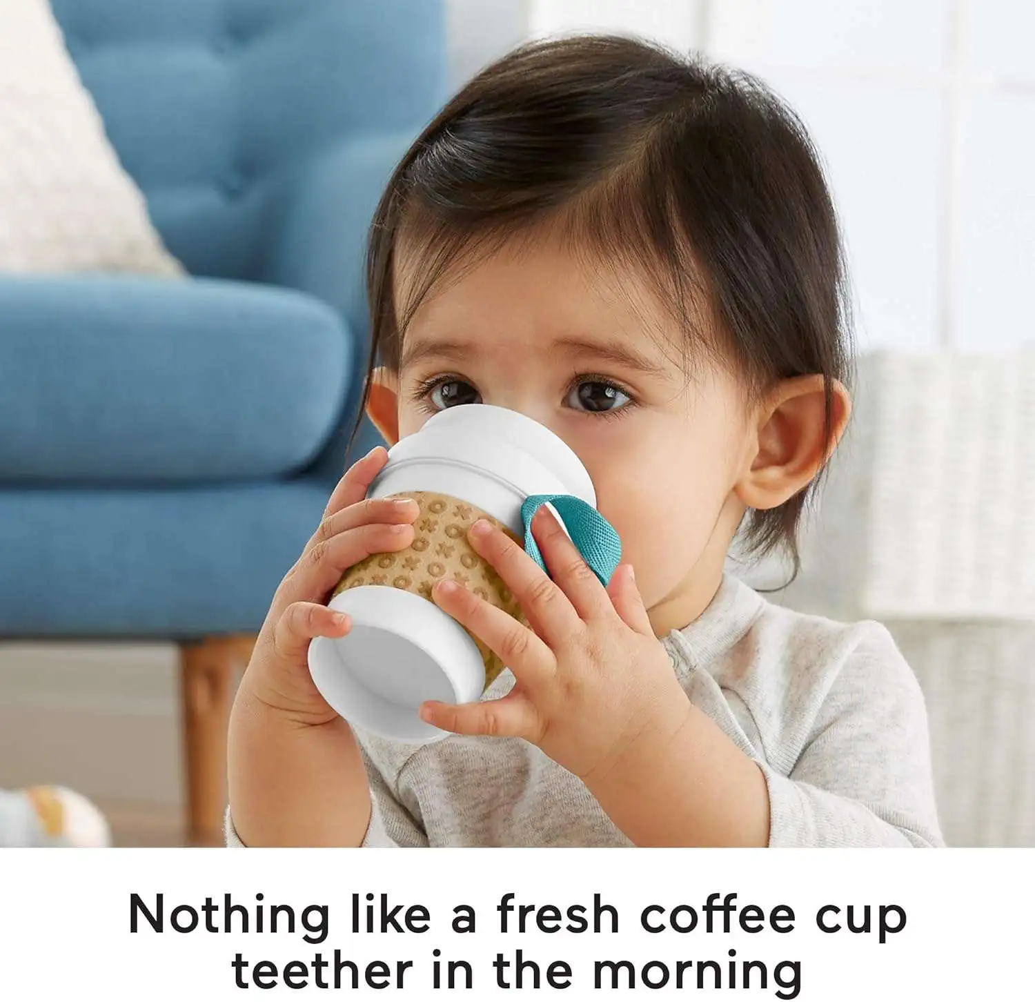 - BPA-free coffee cup teether and cute, checkered crinkle napkin