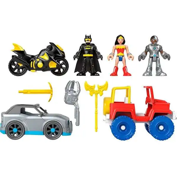 - Kids can send each DC super hero rolling into action with their own rescue vehicle, batman on his batcycle, wonder woman in a 4 x 4 and cyborg in a race car