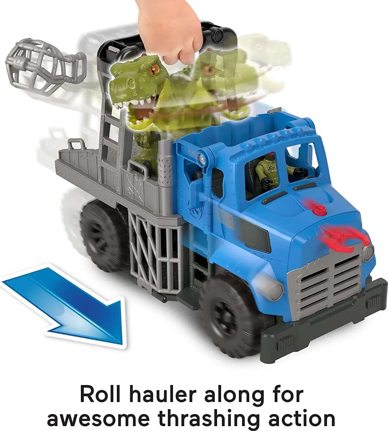 Push the vehicle along to see the dinosaur thrash around and break out