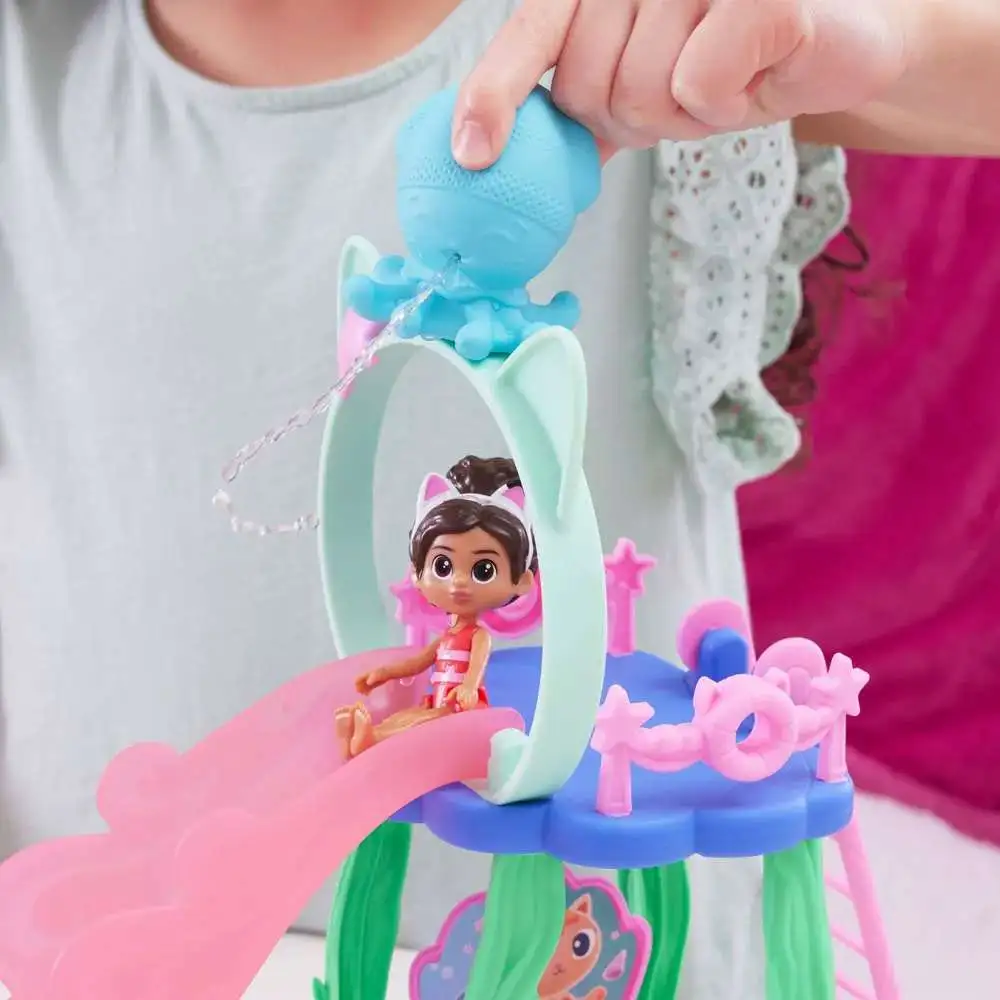 - Squirt Gabby and MerCat with water, from Squiddy Kitty, to activate their color-changing tails, before speeding down the swimming pool slide to make a splash!