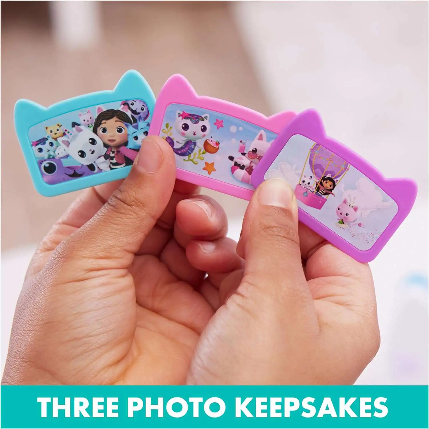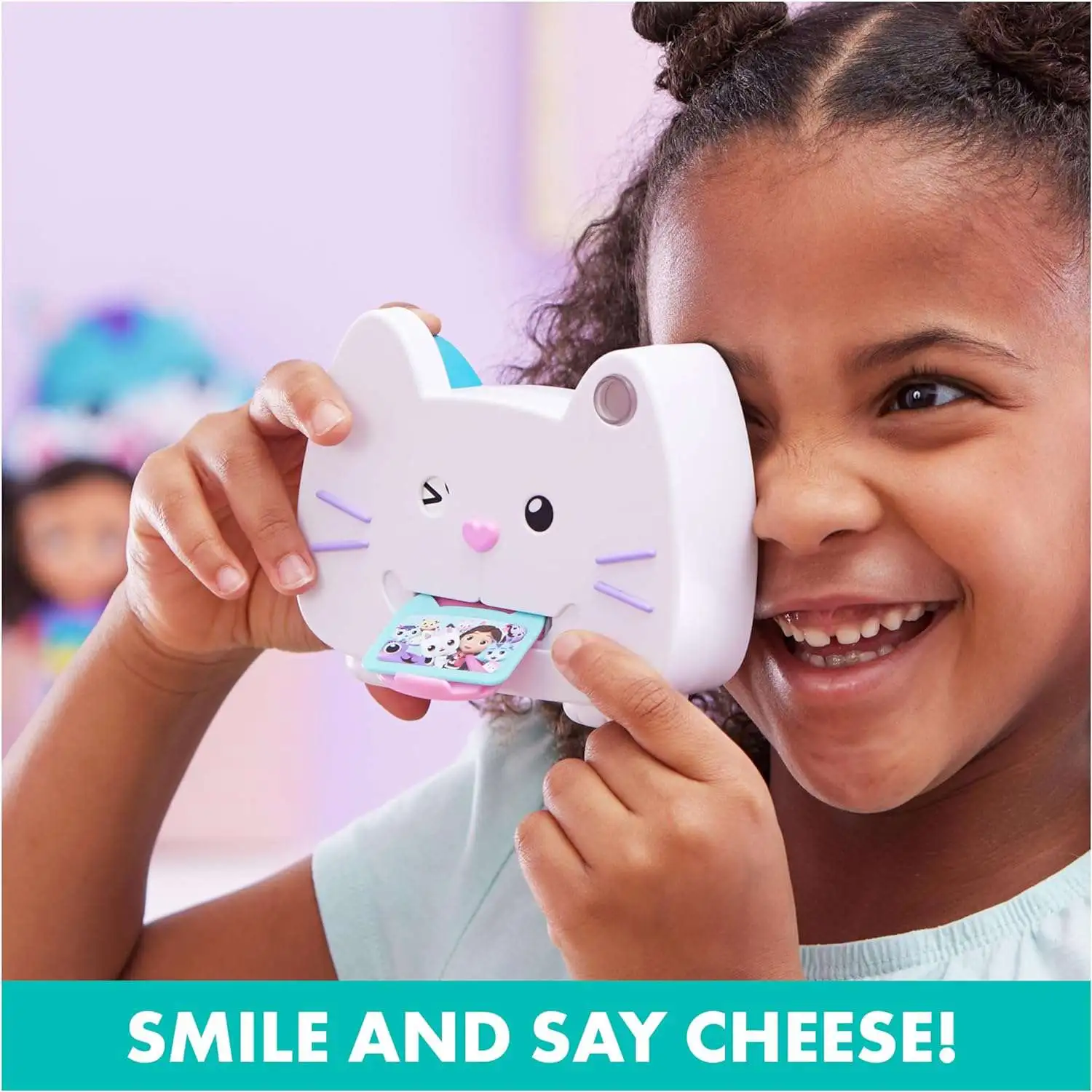 - Smile and say cheese, with this Gabby's Dollhouse kids camera! Place the three plastic photos in the rear image panel and click, to watch a photo pop out of Kitty's mouth!