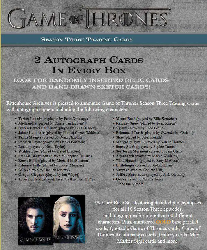 Game of Thrones Season 3 Trading Card Box [24 Packs] has successfully been added to your cart!