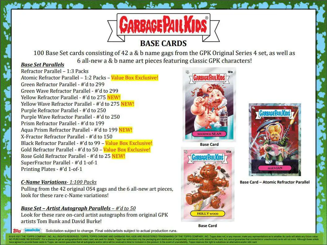 Collect the entire 100-card Base Set consisting of all 42 Original Series 4 pieces of art, as well as 6 all-new art pieces of classic Garbage Pail Kids characters!