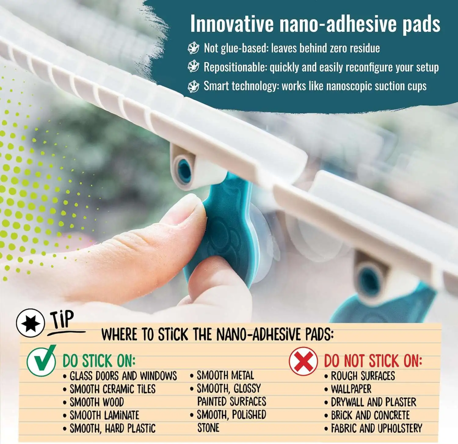 - Intuitive & Mess-free: Tracks attach to smooth surfaces with the help of clever nano-adhesive pads that create a strong but temporary bond; the pads are not glue-based and can be quickly and easily repositioned without leaving behind damage or sticky residue.
