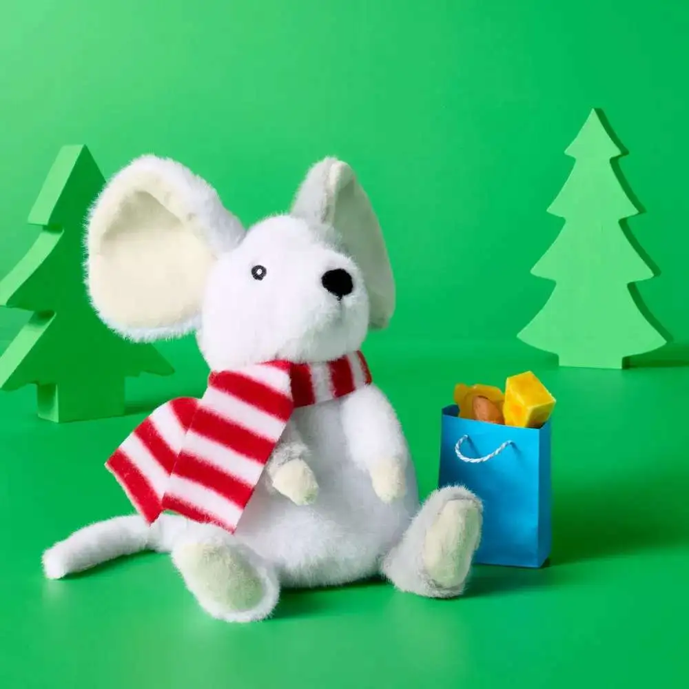 - Adorable 7-inch white and gray mouse design with a colorful striped scarf.