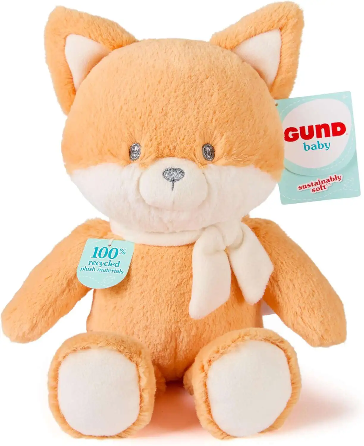 - 100% RECYCLED FOX PLUSH: This adorable, sustainably made 13` fox has soft orange plush and a modern design with a long, cream-colored bow around its next. This fox stuffed animal is crafted from recycled materials, from its stuffing to the packaging.