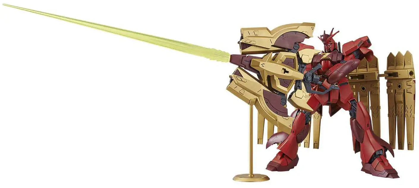- Features a red Nu Zeon Gundam with Cape Funnels, large sword, and Zeon-inspired design details.