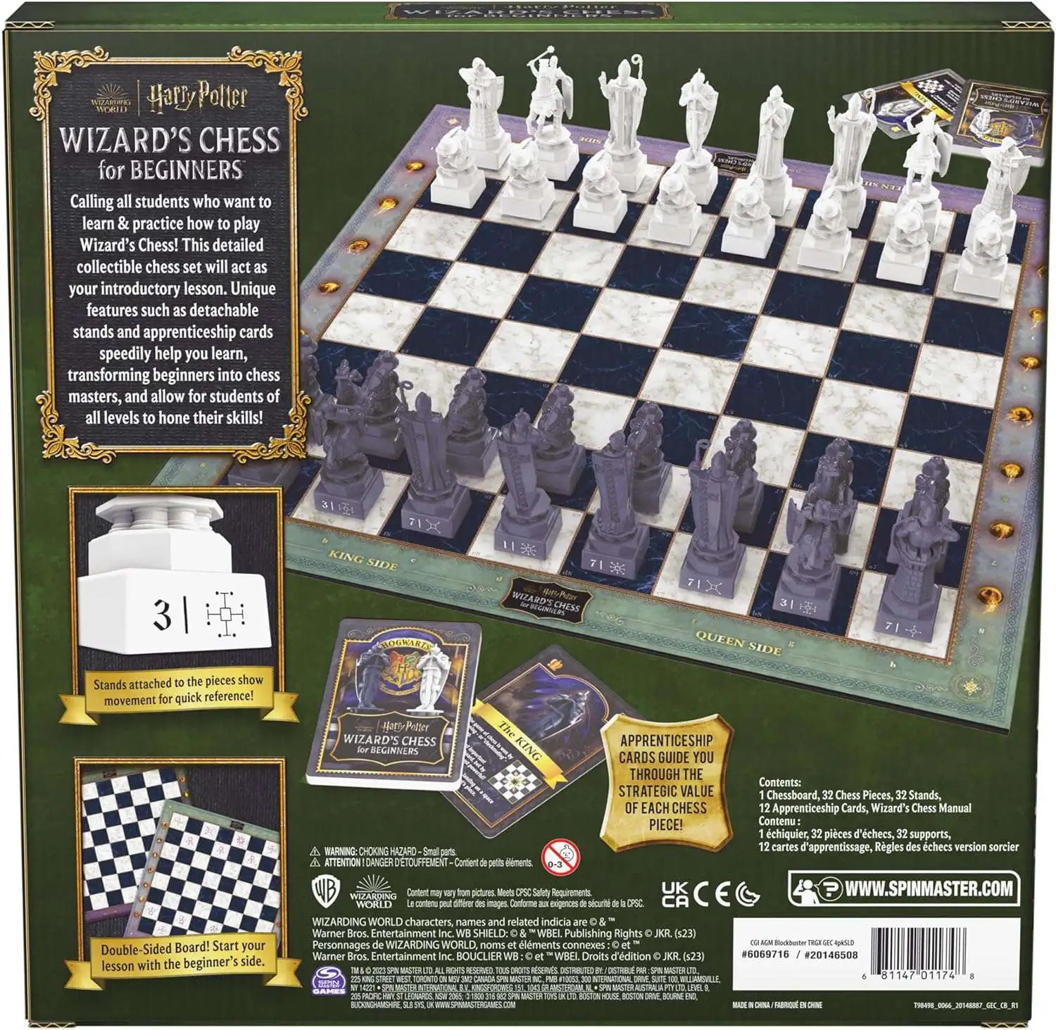 - Includes: Chessboard, 32 Chess Pieces, 32 Stands, 12 Apprenticeship Cards, Wizard's Chess Manual