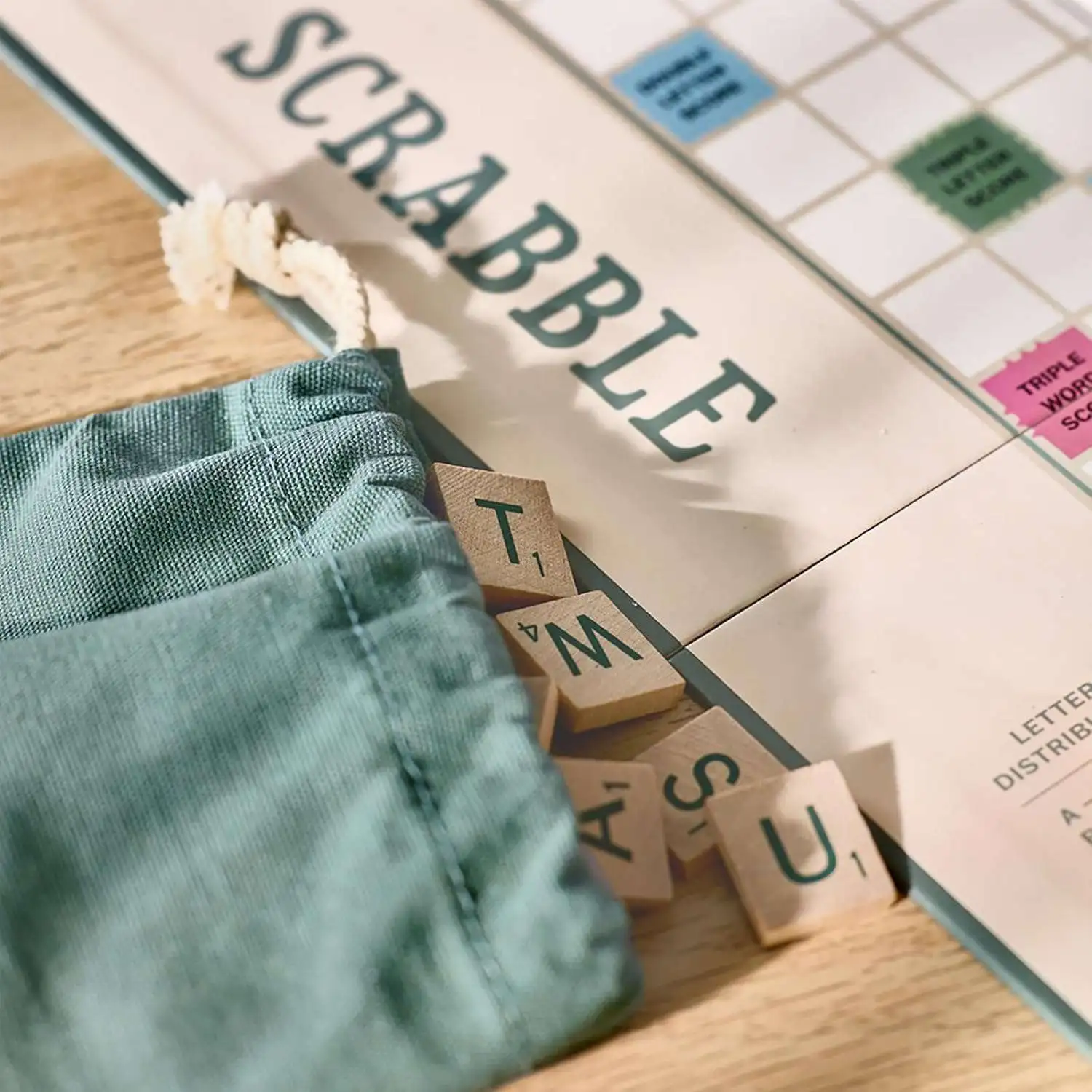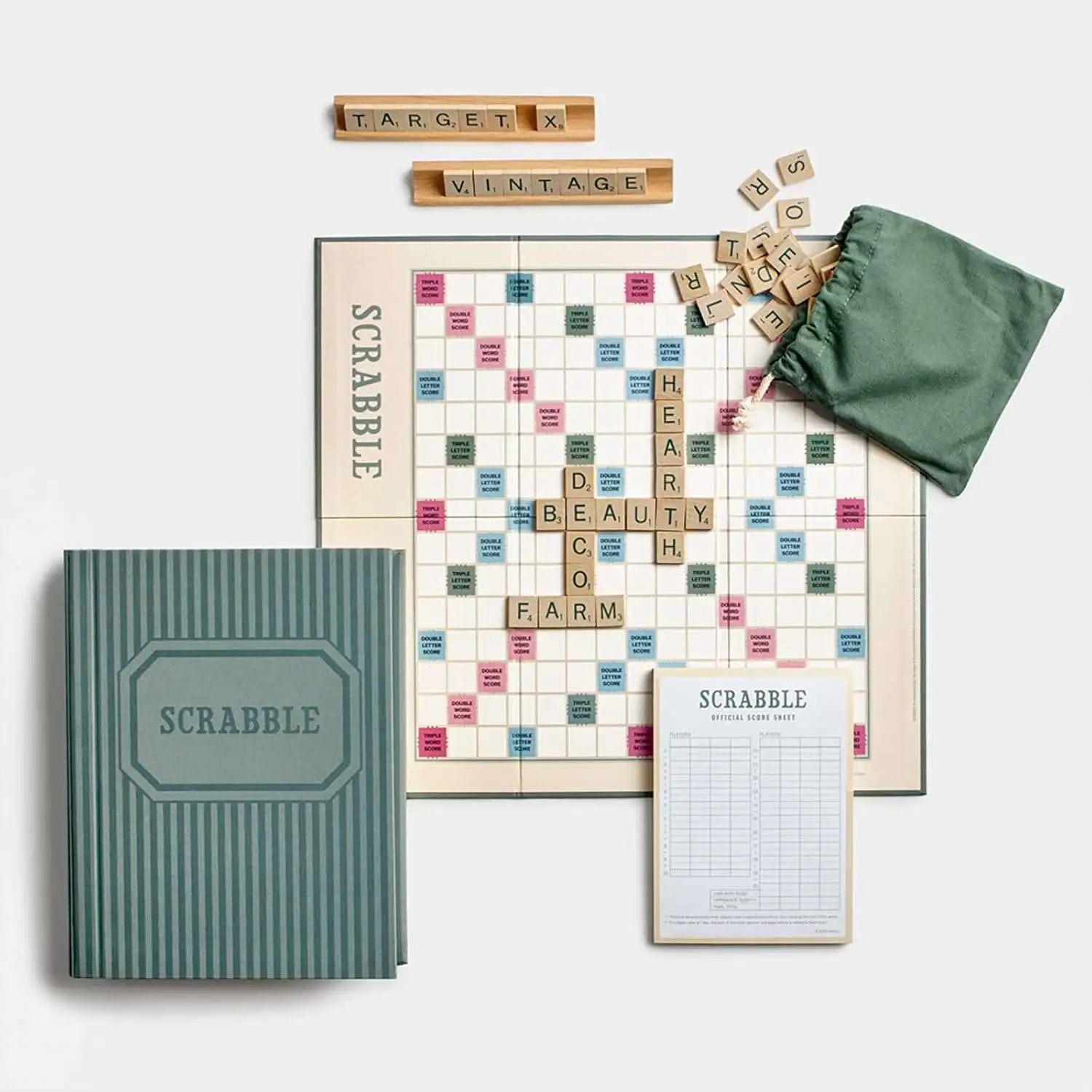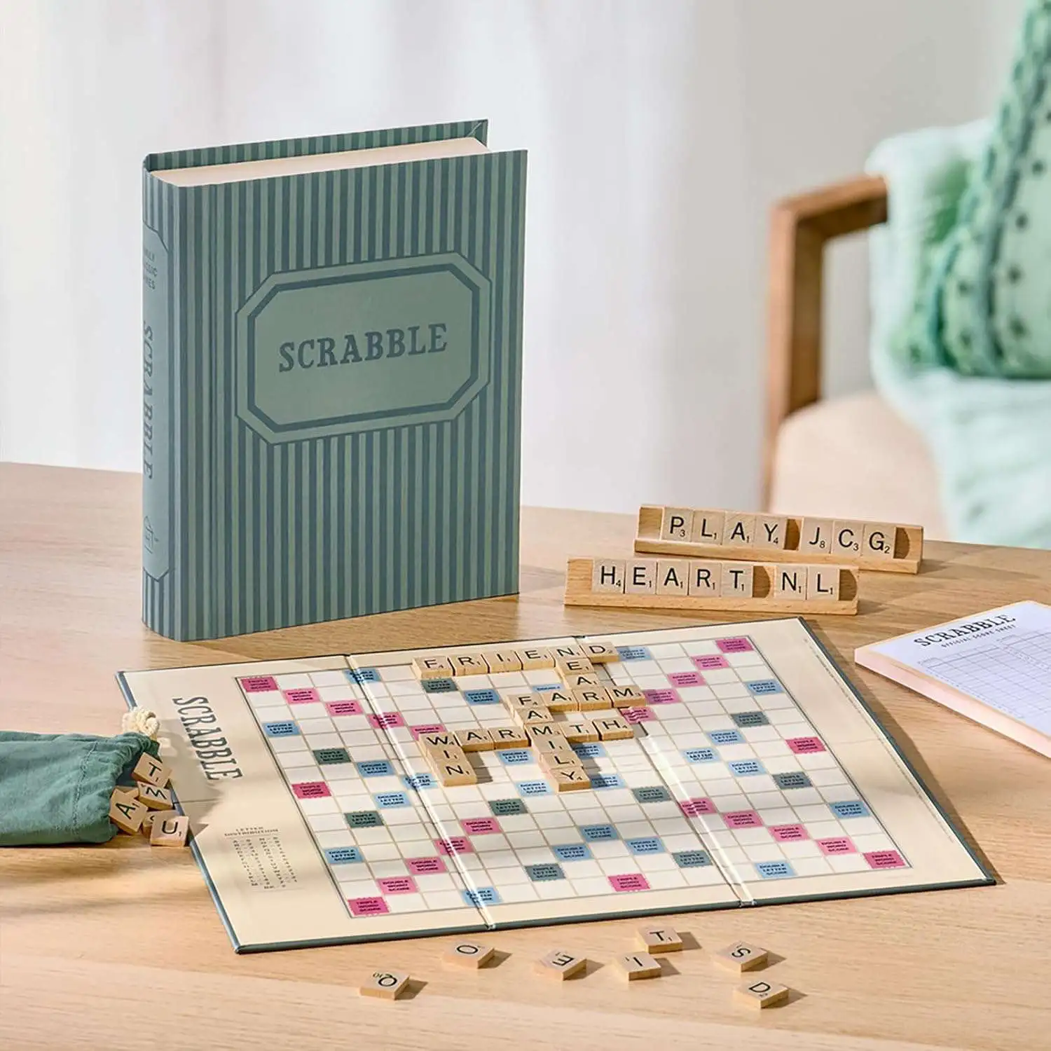 - Full-size folding game board, 100 wood letter tiles with pouch and 4 wood tile racks