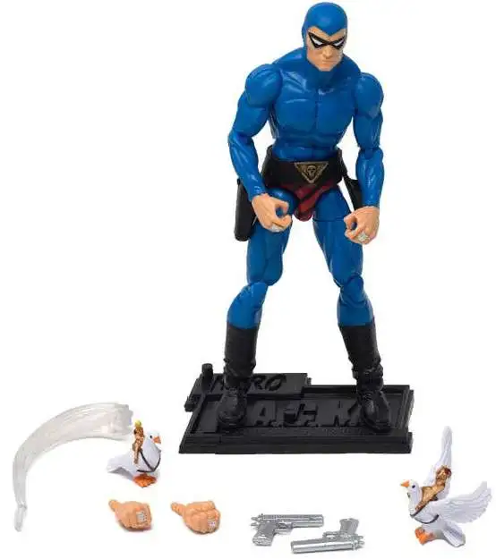 These figures bring you through the ages. This figure is the 21st Phantom in his blue costume - detailed, highly articulated, and ready to play and display! He comes with doves and their clear display stand for flight simulation, Vlad and Melodee riders, a holstered belt, pistols, extra hands, and a figure stand for display.