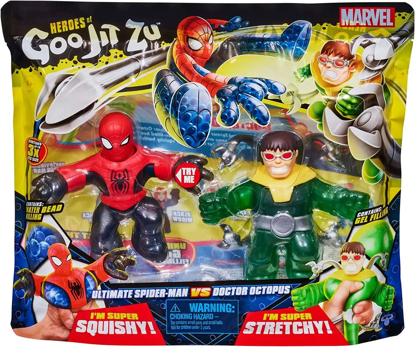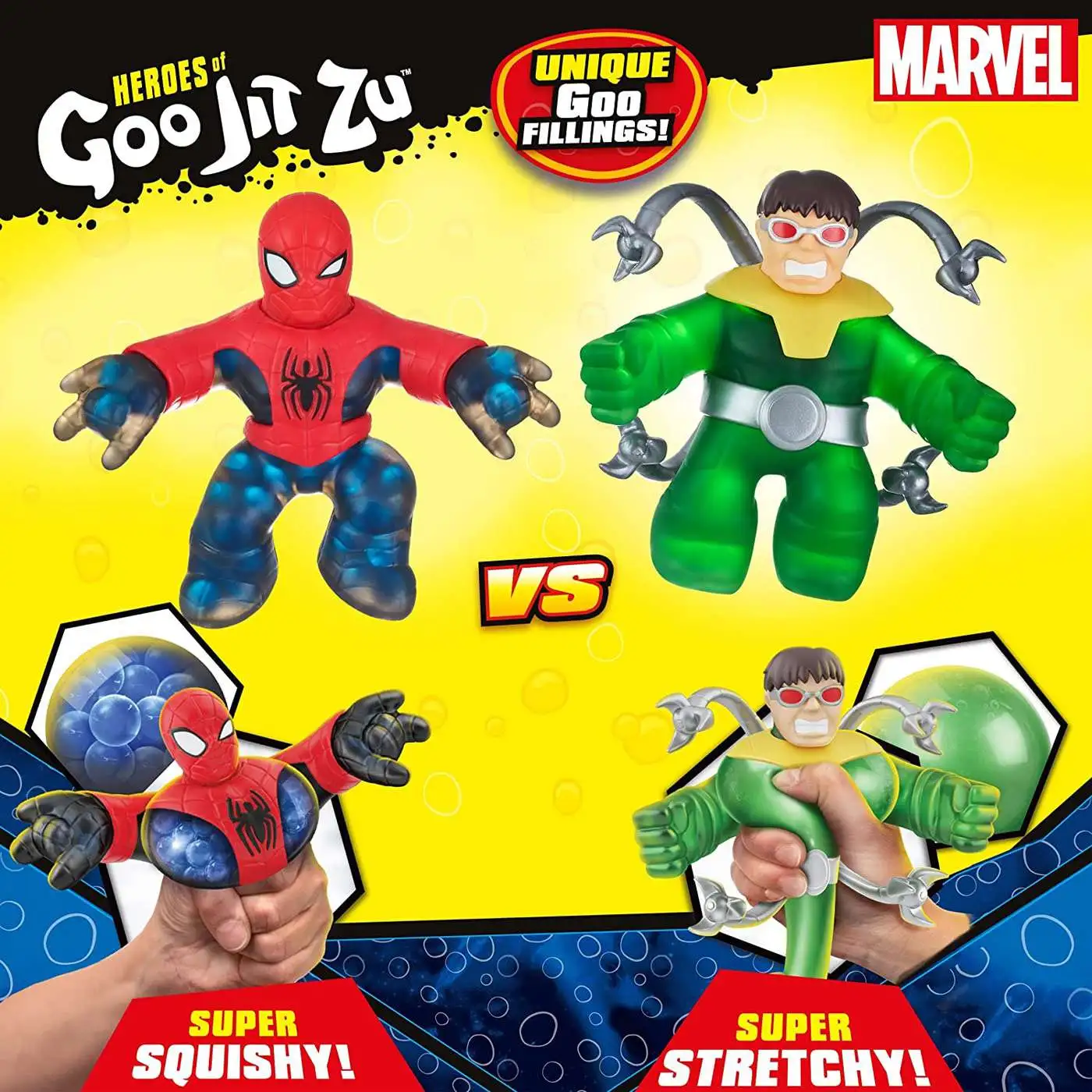 - Features two Marvel heroes with unique goo fillings: a squishy Spider-Man with water beads and a stretchy Doctor Octopus with green gel, offering tactile variety and fun.