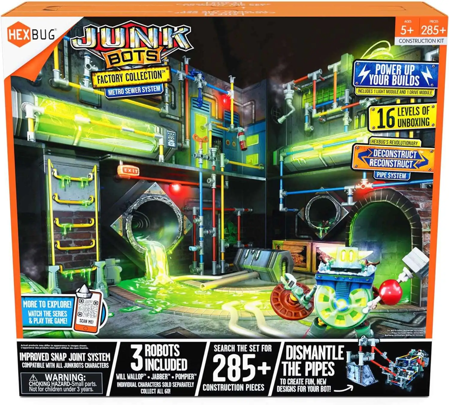 - The JUNKBOTS Large Factory Habitat - Metro Sewer System playset is unboxing to the max! Search for parts, build your bots, and power up with light and motion modules! 3 new collectible robot characters and playset habitat included. Construction system made up of character components + pipes & connectors built into the playset. Deconstruct then rearrange to construct characters and contraptions for your bots to utilize.