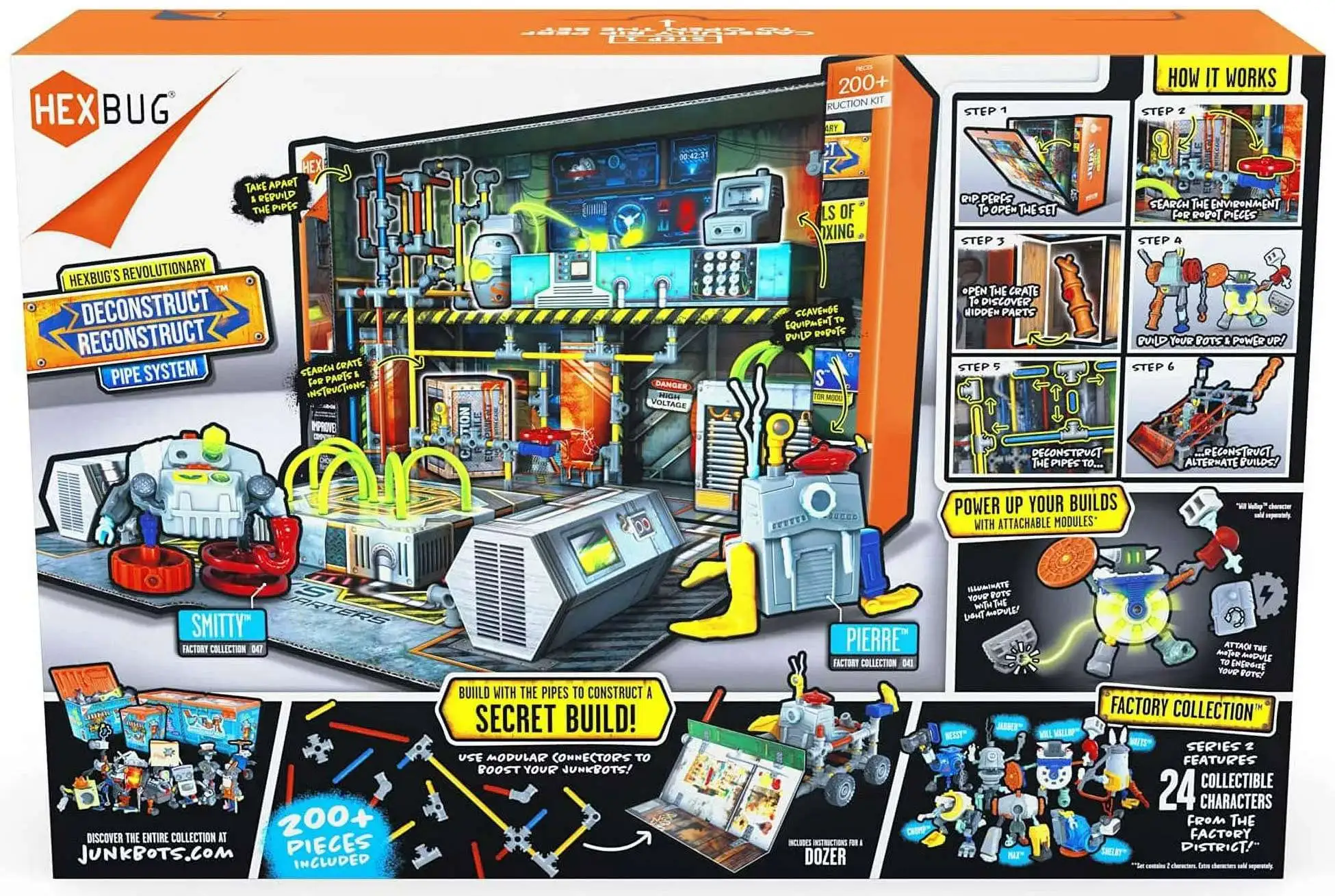 - The JUNKBOTS Small Factory Habitat - Rev's Secret Headquarters playset is full of surprises! Unbox the top-secret nuclear facility to find hidden parts, build all-new JUNKBOTS, then deconstruct and reconstruct! 2 collectible robot characters & habitat included. 200+ construction pieces. Construction system made up of character components + pipes & connectors is built into the collection. Deconstruct to construct characters & contraptions for bots to utilize.