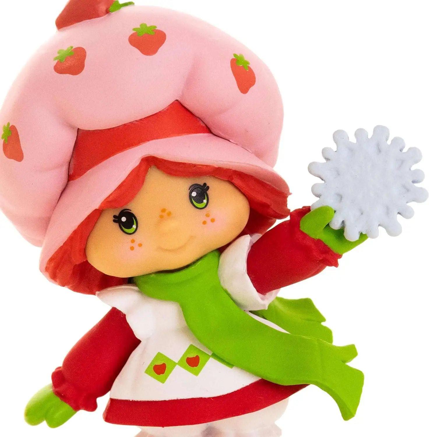- Features three beloved Strawberry Shortcake characters dressed for winter, including Strawberry catching snowflakes, Orange Blossom skiing, and Lemon Meringue caroling, capturing a festive holiday scene in charming PVC figures.