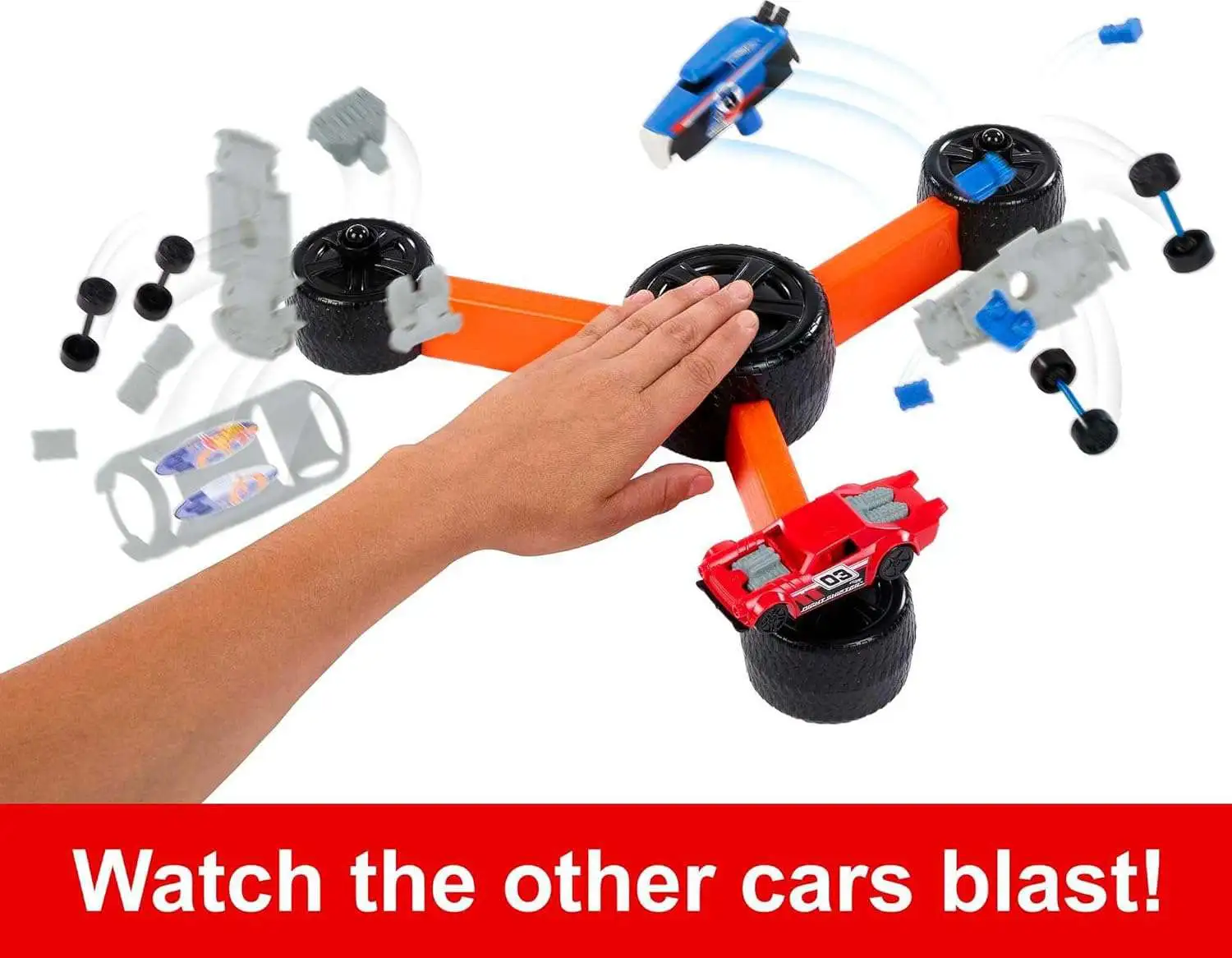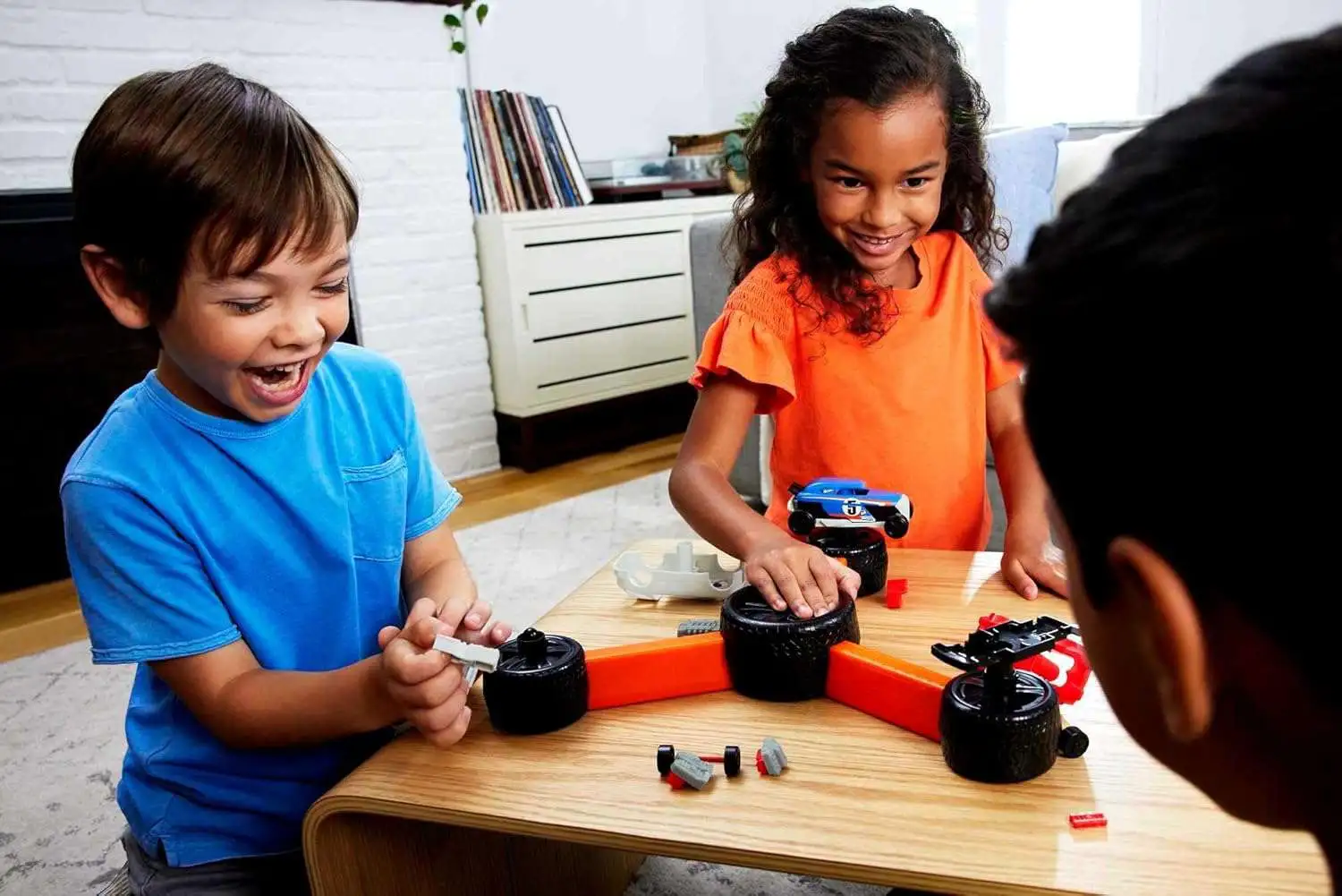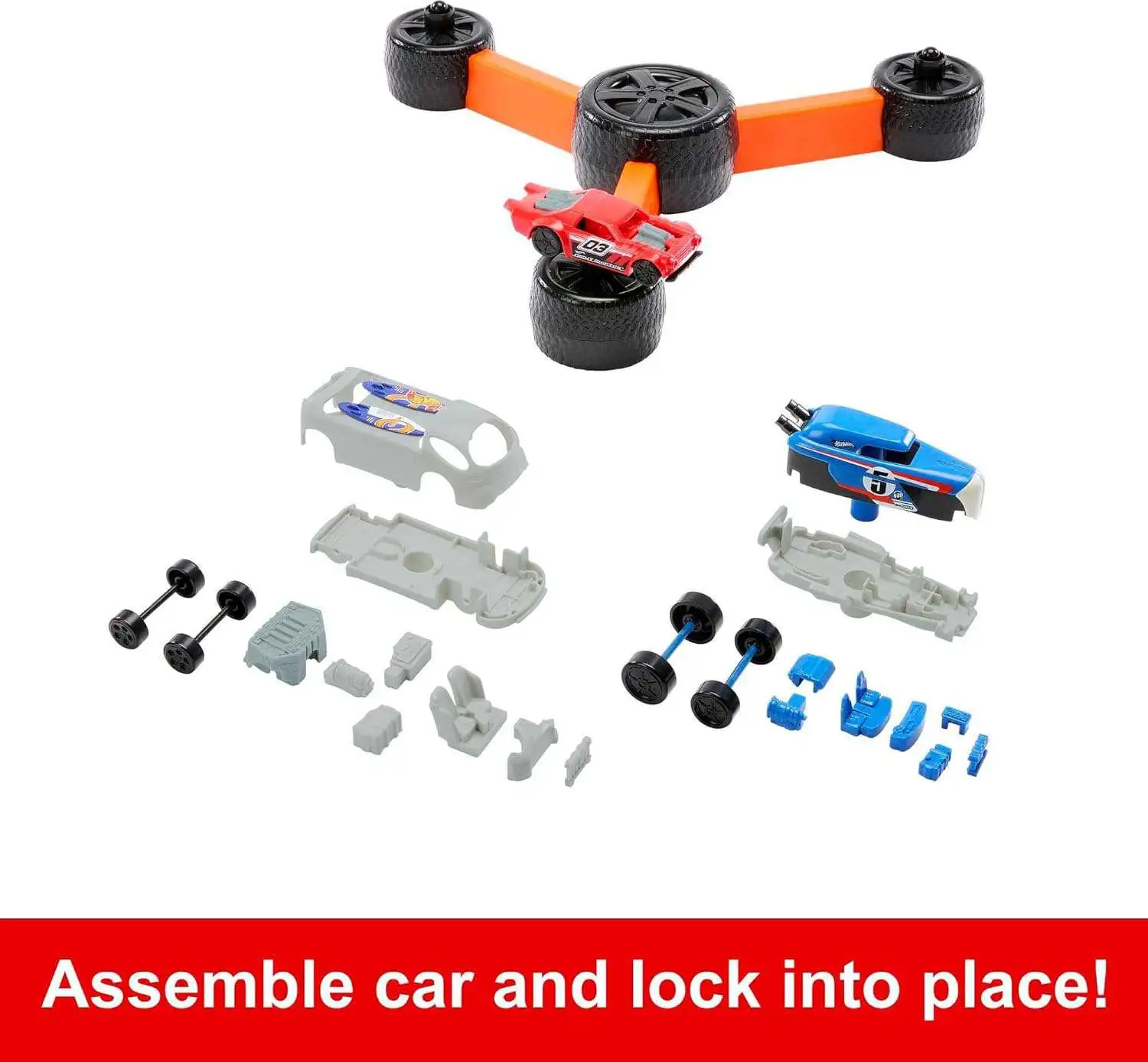 - 1-3 players race to see who can build their Hot Wheels car the fastest. The first player to lock their car and push the center tire wins the lap!