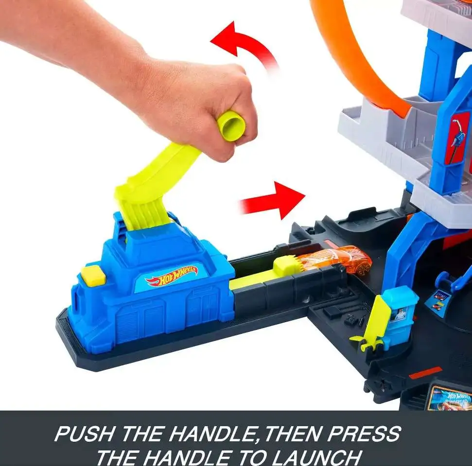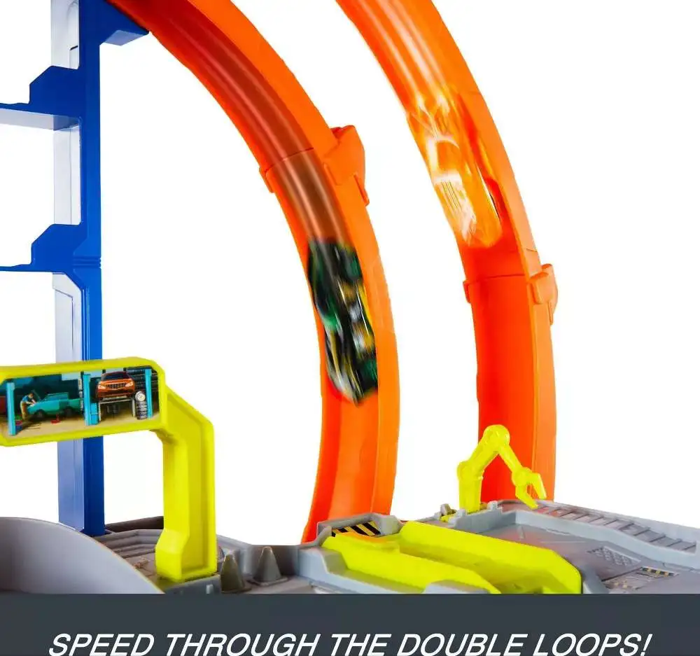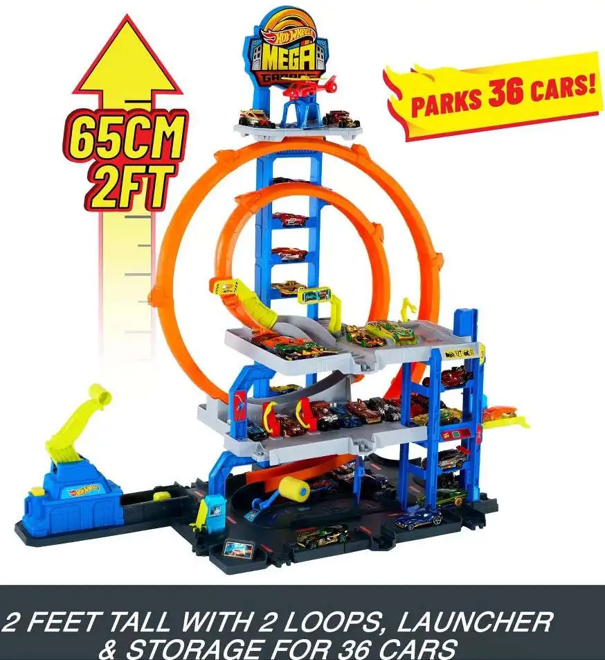 - Explore multiple levels of toy car play with the Hot Wheels Mega Loop Garage playset.