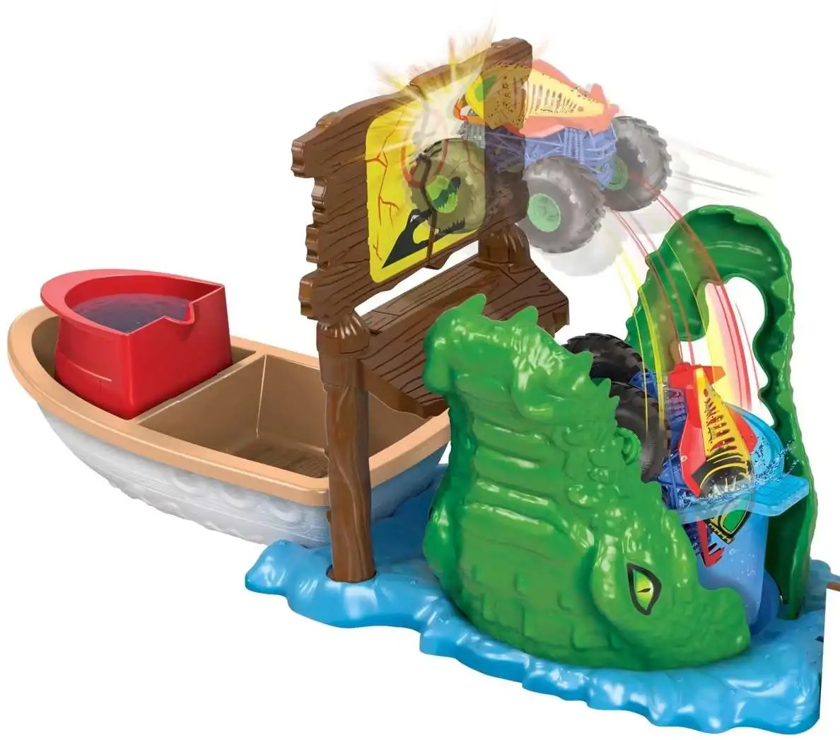 - Kids launch their Color Shifters Monster Truck over the croc's mouth and into a sign. If they don't break through it, the truck will fall into the icy water, initiating an immediate and magical color change! When kids pull the truck out, it'll have a different design and deco