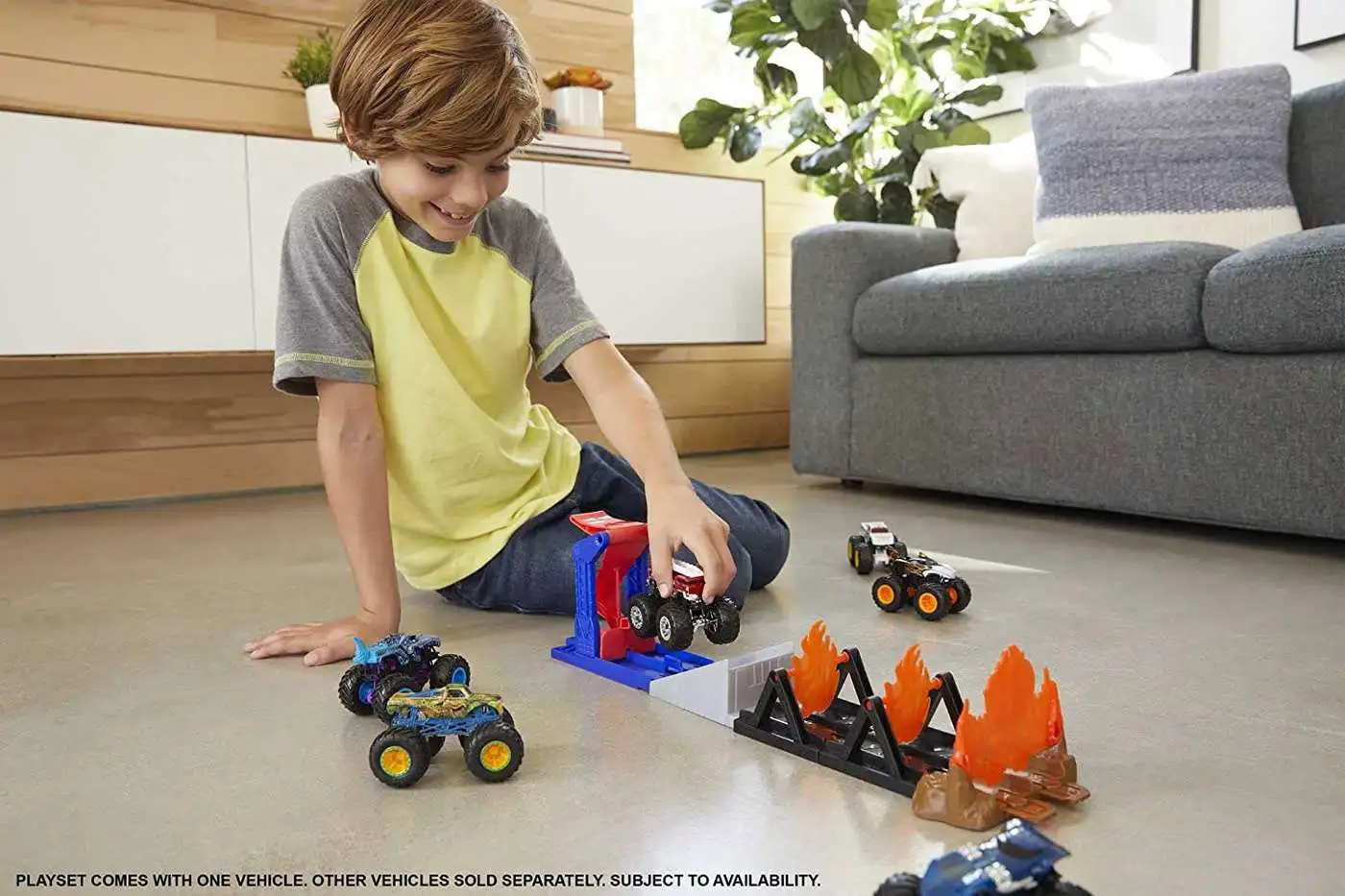 - Unlock kids' imagination and heroic storytelling with the Hot Wheels Monster Trucks Fire Through playset!