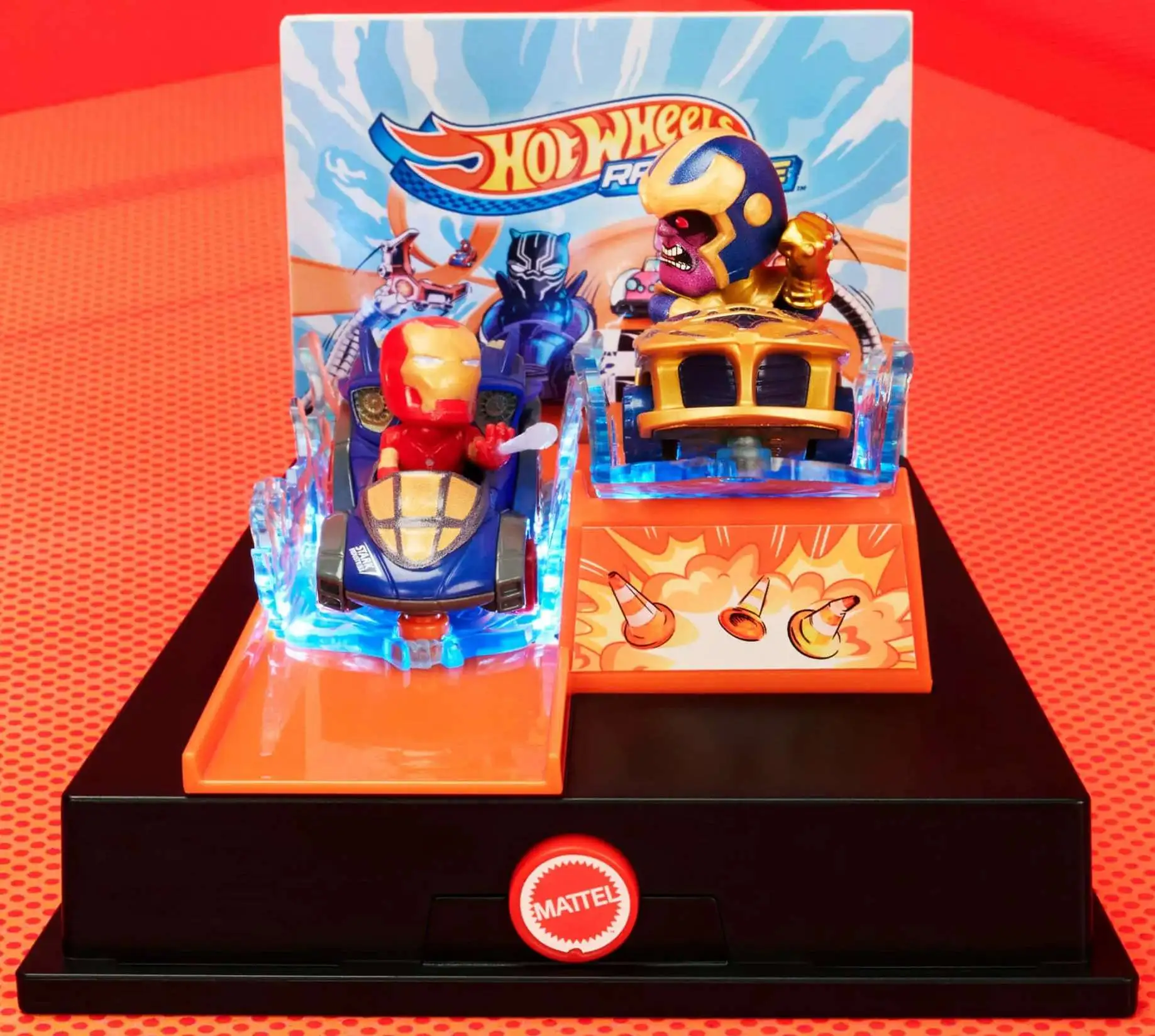- Includes 1:64 versions of Iron Man and Thanos RacerVerse vehicles