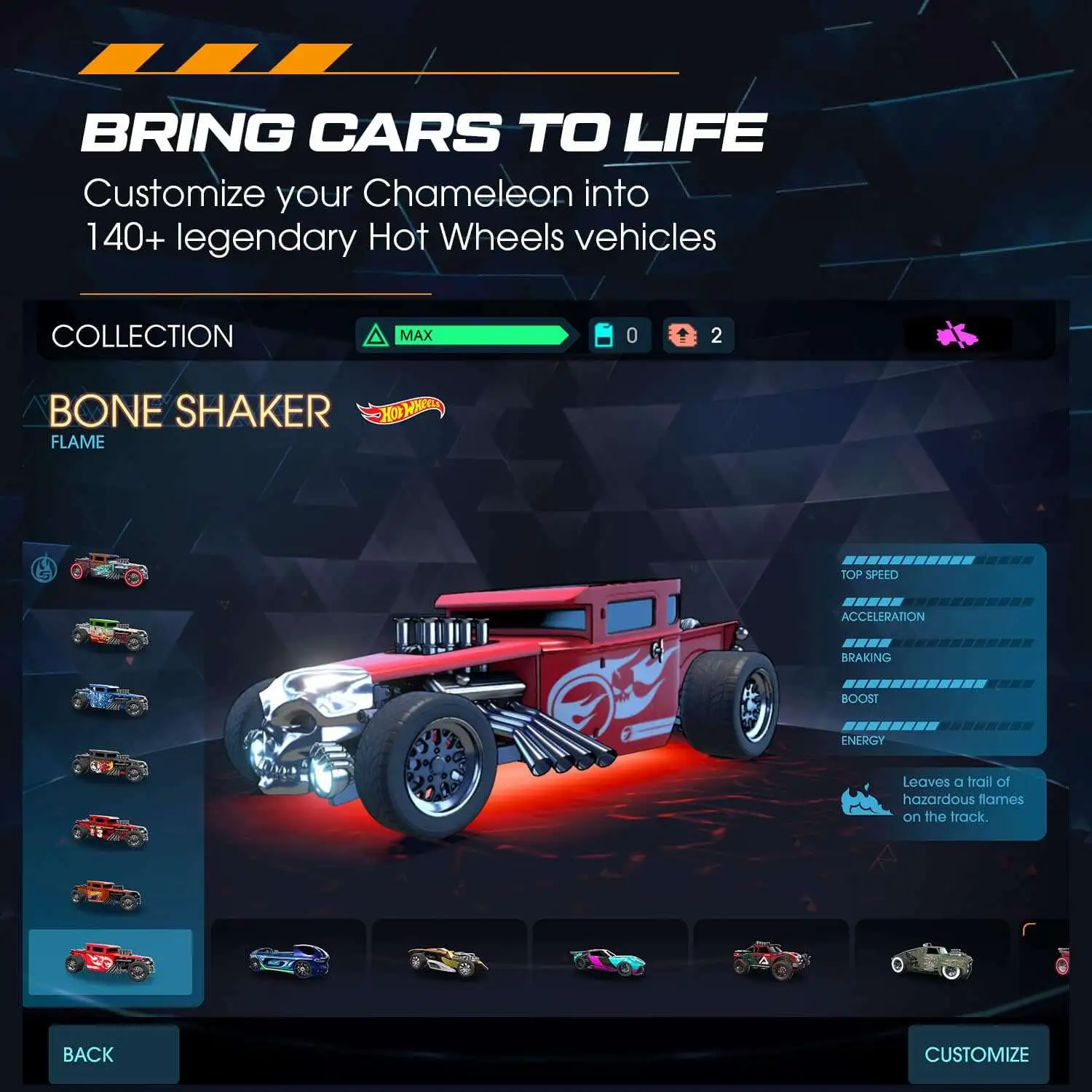 - Get behind the wheel of 140+ legendary Hot Wheels vehicles. Fully customize your ride with options for speed, acceleration, braking, boost, and energy