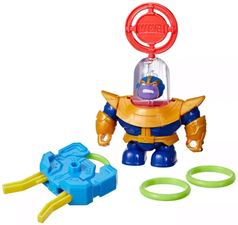 - SUIT UP IN AQUA ARMOR: Place the Thanos pod inside his Aqua Armor, load a disc into the launcher, and pinch the handles to fire a disc at the target