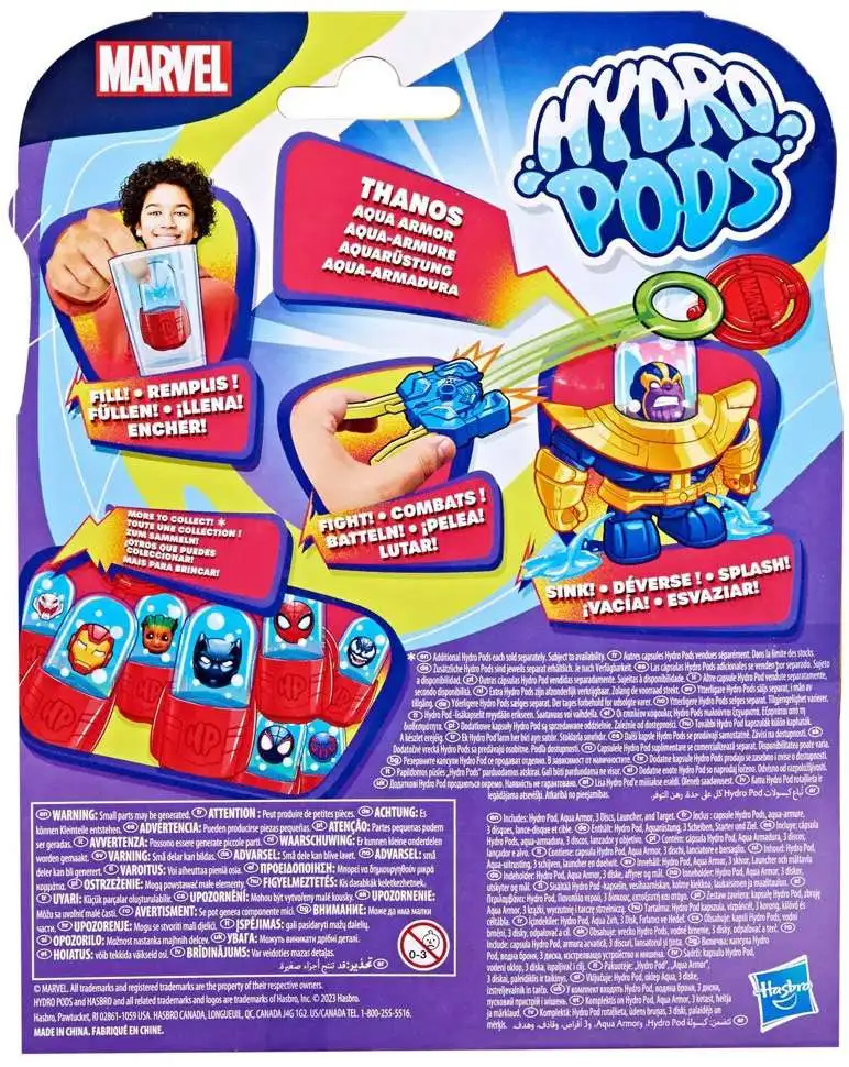 - THANOS AQUA ARMOR: This Hydro Pods toy has everything needed to launch your collection -- including 1 Thanos Hydro Pods character (4 inches tall, 10 cm), 1 Thanos Aqua Armor, 1 target, 1 launcher, and 3 discs