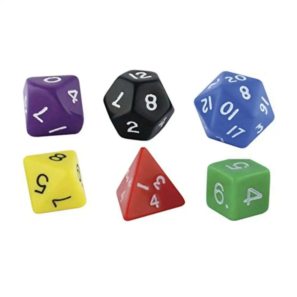 6 polyhedral dice (D4, D6, D8, D10, D12, D20)