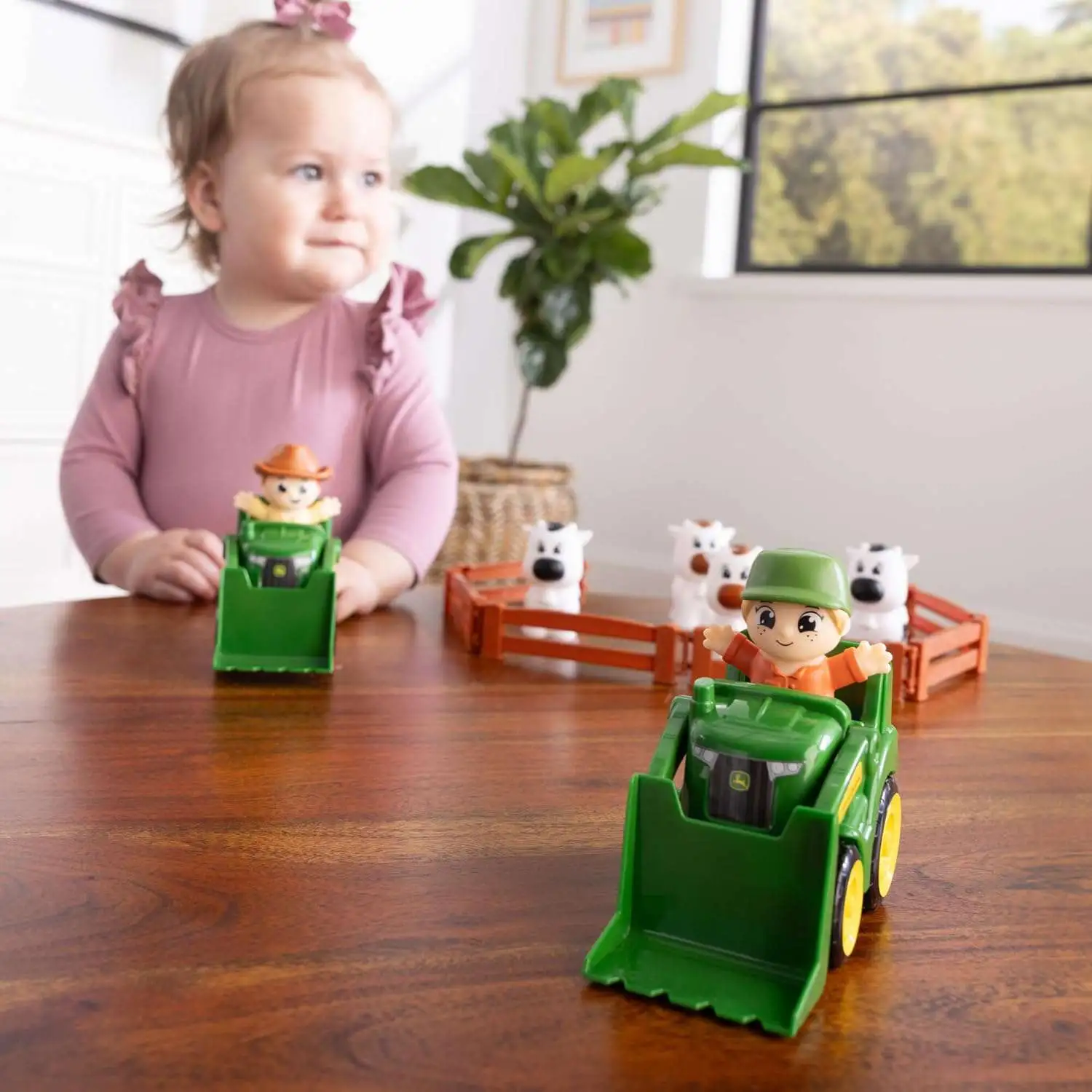 - Working Parts: Each tractor features a front loader that can be raised and lowered, Farm Fun Toy Set: Includes 2 tractors, 2 farm figures, 4 cows, and 6 fence pieces