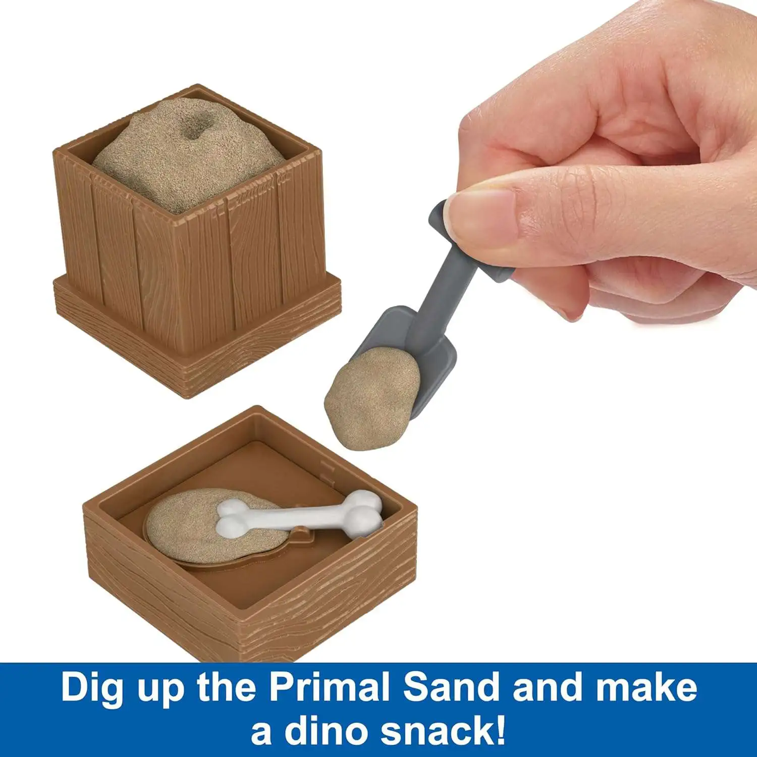 - Dig it! After removing the test tube, open the mystery box on the side to reveal Primal Sand. Release the mini shovel from the wall to dig thru and use the lid of the sandbox as a snack-making accessory.