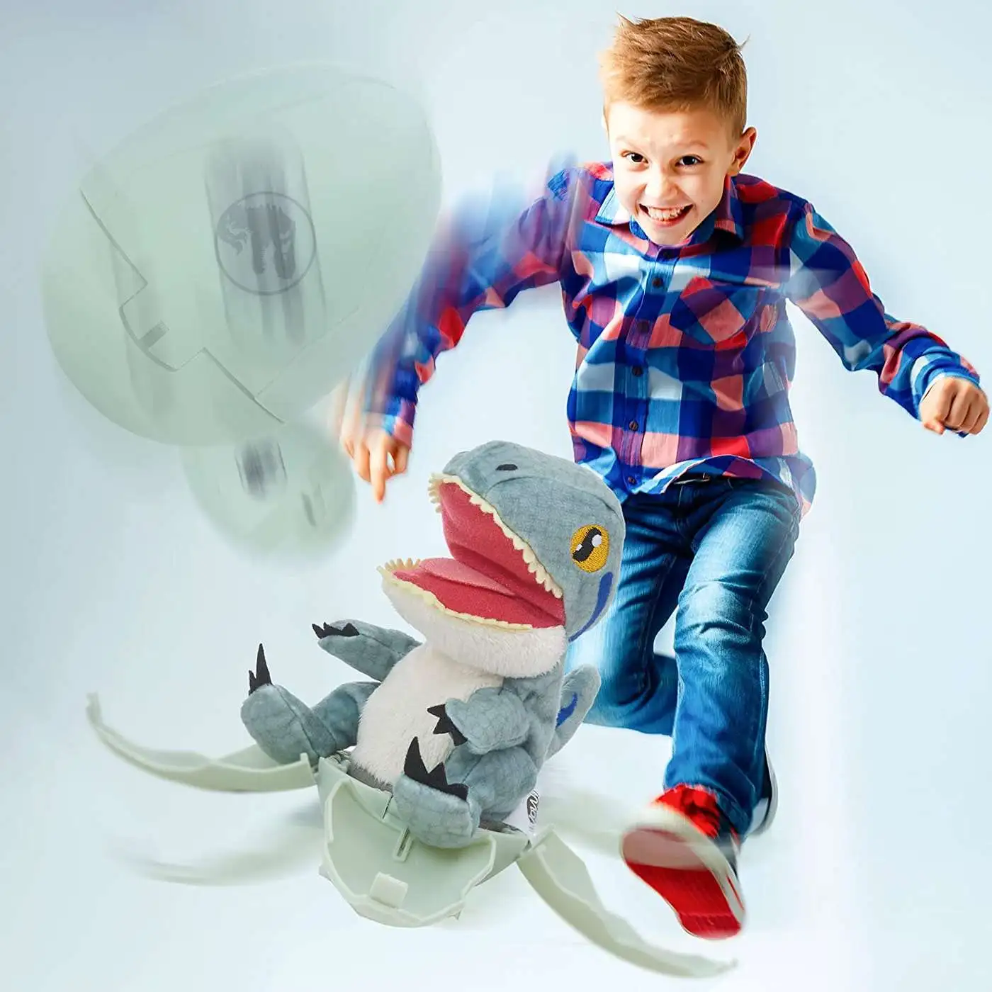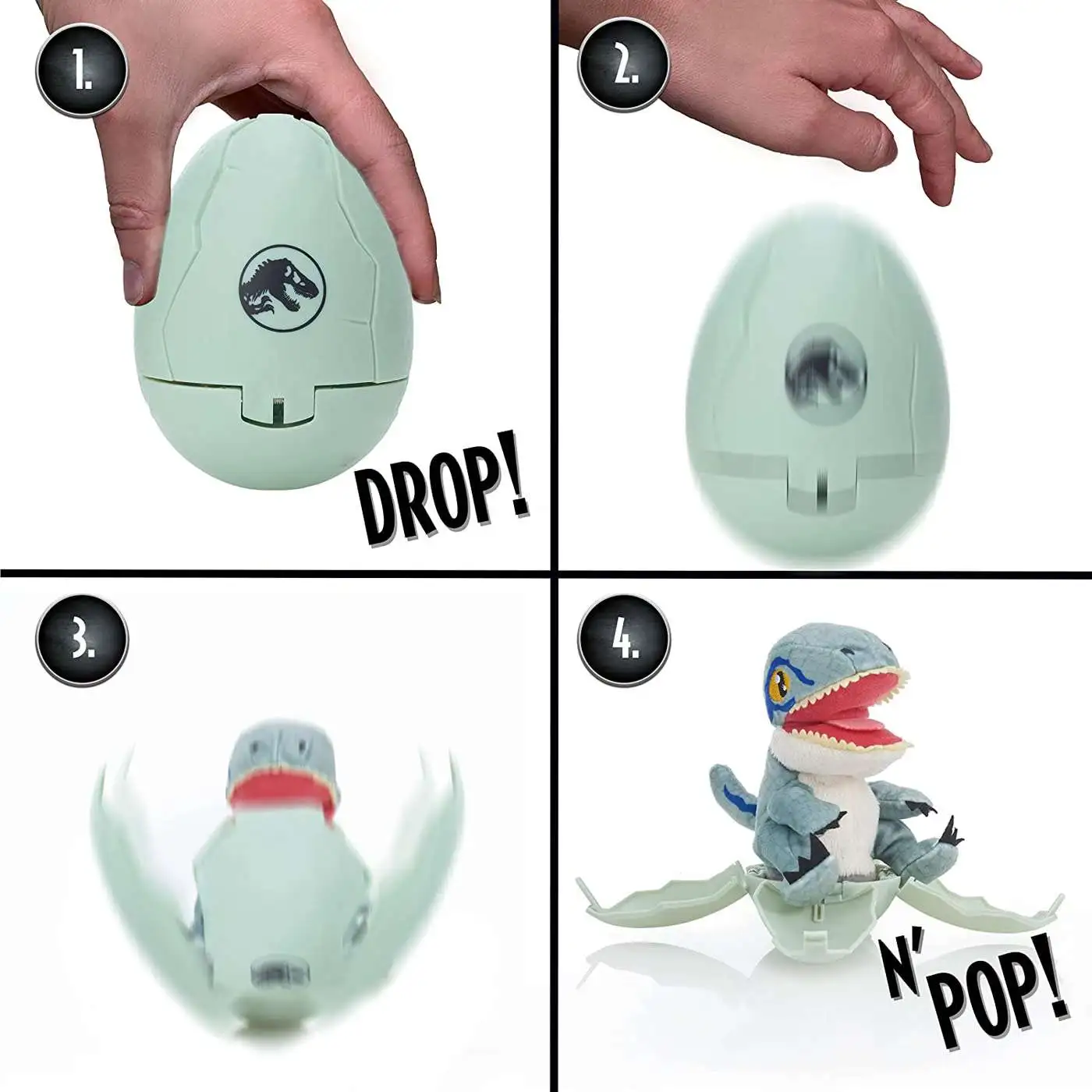 - Drop to Pop and reveal - Play out some of the iconic movie scenes from Jurassic Park by watching your dinosaur hatch by simply dropping onto any floor, table or countertop. Reveal a plush baby dino teddy 150% bigger than the egg