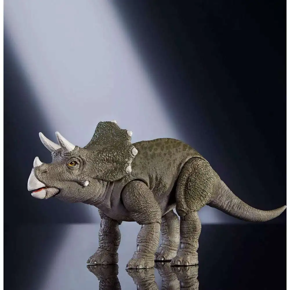 - Posable, movie-accurate design! This Jurassic World young Triceratops figure has life-like details like glass eyes and jointed tail. Its 14 posable joints include a mouth that opens to 40 degrees