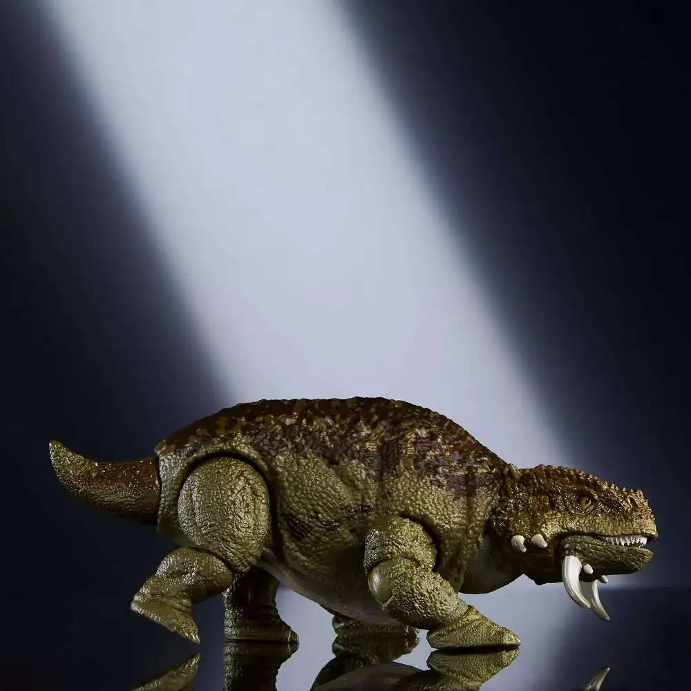 - Posable, unique design! This Scutosaurus figure has life-like details like glass eyes and jointed tail. Its 14 posable joints include a mouth that opens to 45 degrees