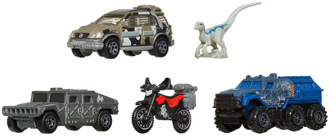 - Excite young fans with the Jurassic World Matchbox Dinosaur Capture Team 5-Pack, featuring four 1:64 scale die-cast vehicles inspired by the film franchise, plus a mini dinosaur for creative adventures. Each vehicle boasts authentic designs for realistic storytelling, making it perfect for building open-ended, imaginative play. The set includes a variety of cars and trucks from the entire Jurassic World series, including Rebirth, encouraging collectors and storytellers alike to create adventurous scenes. Durable and detailed, these vehicles foster development of creative skills and provide endless fun, bringing jurassic excitement into any playroom or collection.