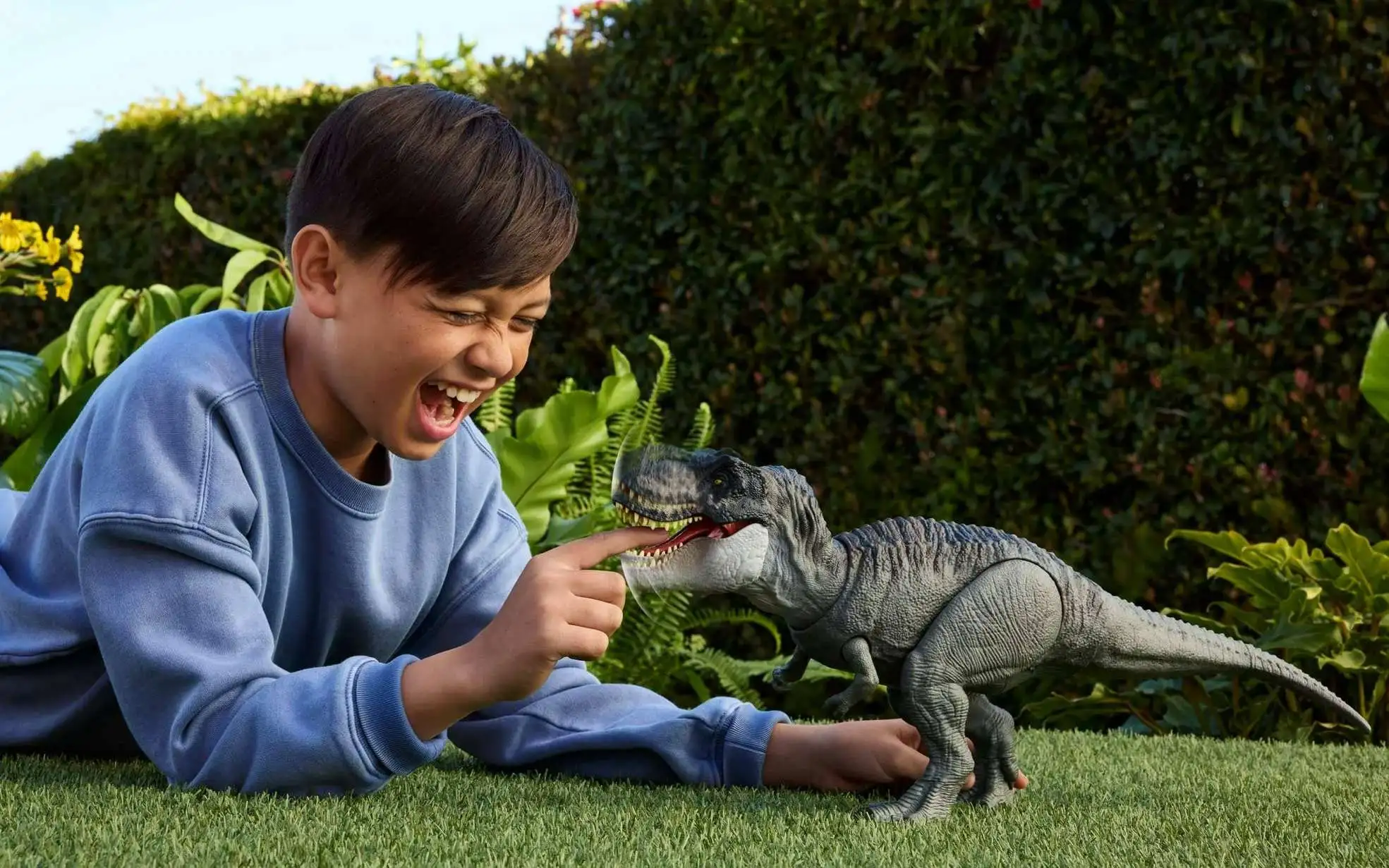 - Beware the T. rex! Pressing the tongue down once results in a roar, but when a finger or another dinosaur figure holds the tongue down, a frenzy of continuing chomping, roars and light effects take over!