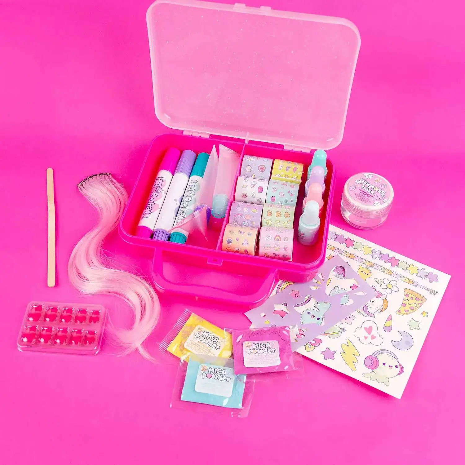 - 3 Hair Chalks, 1 Mixing Stick, 3 Mica Powders, 1 Sticker Sheet, 5 Nail Polishes, 1 Faux Pink Hair Extension (6 in.), 1 Pink Funnel, 1 Strawberry-Scented Lip Gloss Base (0.78 fl. oz.), 1 Temporary Tattoo Sheet, 1 Stencil, 10 Stick-On Fingernails, 1 Carry Case (7 in. x 1.5 in. x 7 in.), 1 Project Guide
