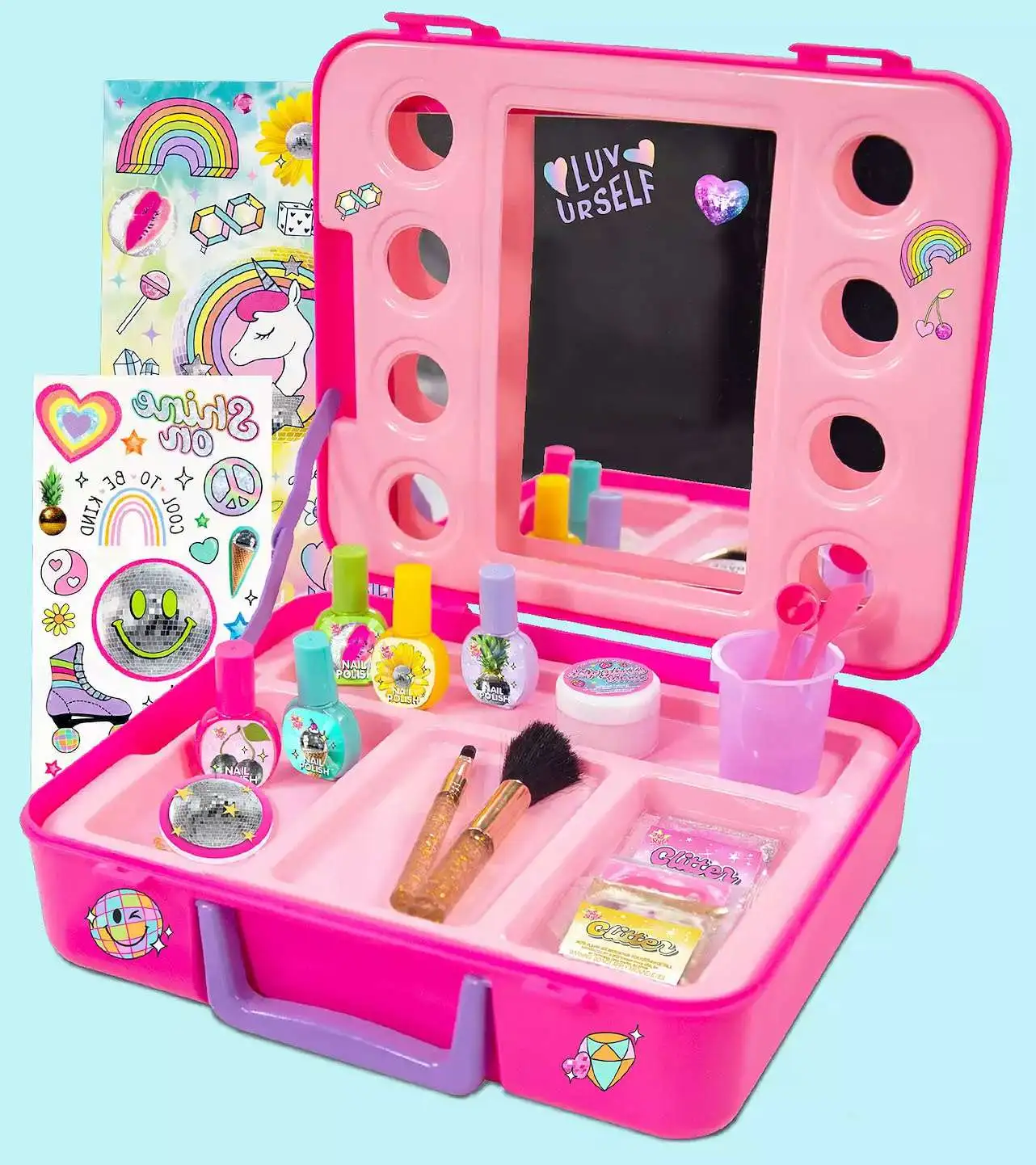 - This beauty set features over 75 pieces of nail art, glittery body art, and makeup in a convenient vanity storage case with a mirror!