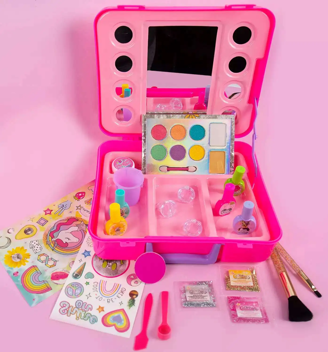 - Includes: 1 beauty case with mirror (10 x 2.9 x 9 in.), 1 eye shadow palette with brush, 5 nail polishes (yellow, pink, green, teal, violet, 2mL each), 1 blush brush, 1 lip gloss brush, 1 tub of strawberry lip gloss base (12 g), 1 nail file, 3 packets of body glitter (0.5 g), 3 empty lip gloss rings, 1 glitter tattoo sheet, 1 sticker sheet, 1 measuring cup, 1 plastic spoon, 1 stirrer stick, easy-to-follow instructions