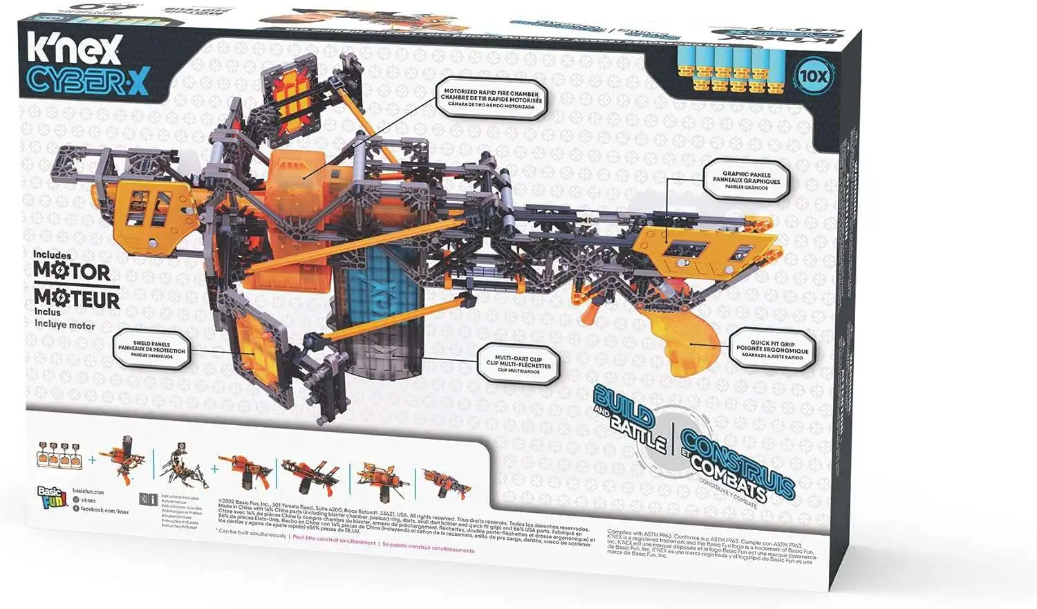 - BUILD, BATTLE, LEVEL UP! Enjoy non-stop excitement as you build your own dart blaster with the ALL-NEW MOTORIZED K'NEX CYBER-X C10 Crossover Legacy with motor! Build from 7 templates or design your own!