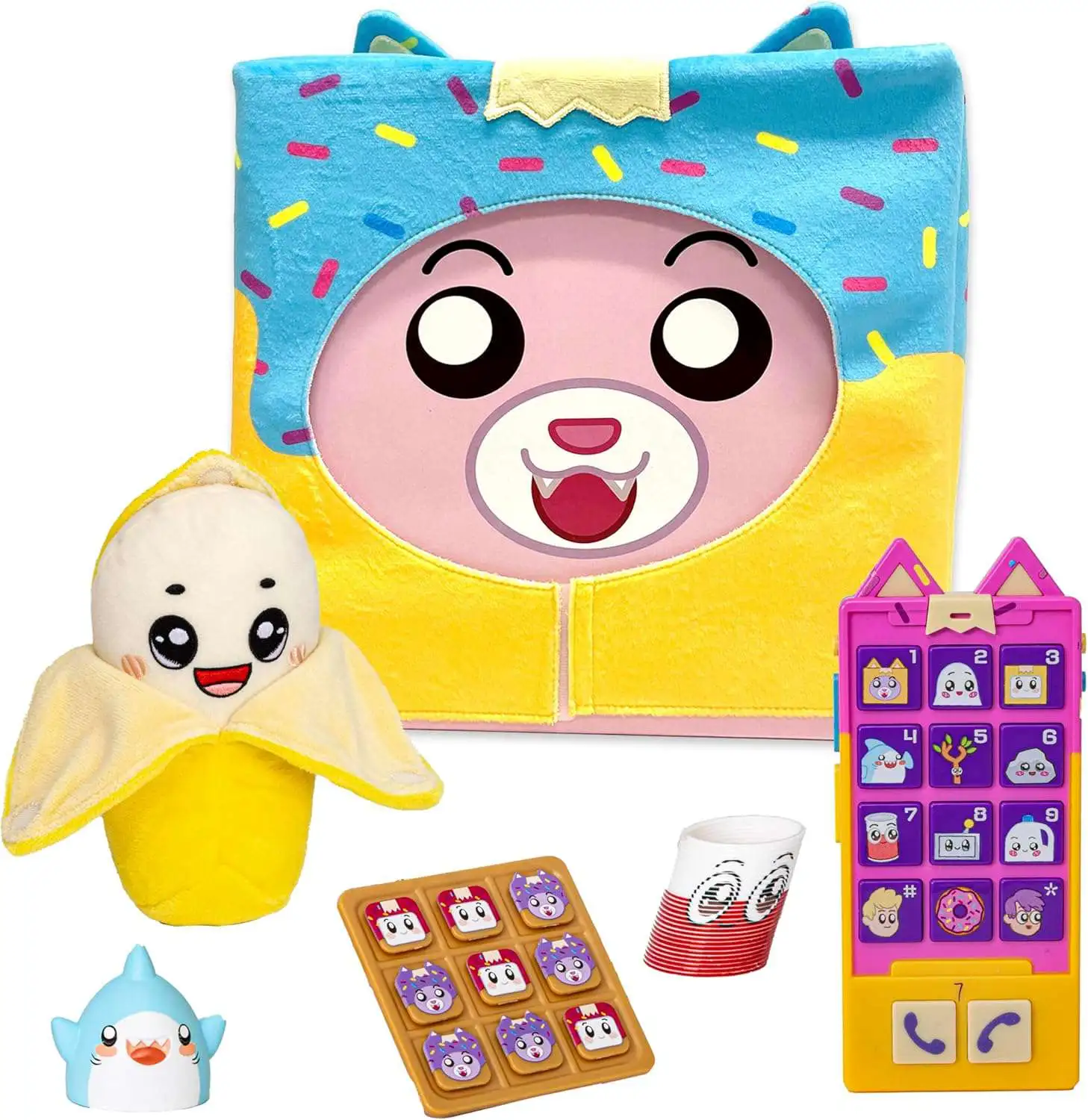 - PACKED FULL OF FUN: Each snack box comes with an electronic phone that delivers iconic LankyBox catcphrases and songs, a huggable plush of their newest character Bananay, a Tic Tac Toe Waffle Game, a Sticky n' Canny Coil Toy, and a Thicc Shark finger puppet--PLUS a plush Foxy mask!