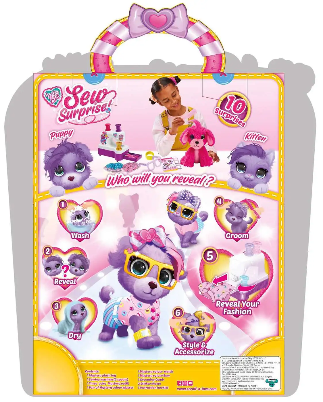 - Scruff-a-Luvs Sew Surprise lets you magically reveal a fashionable outfit for your mystery puppy or kitten and discover 10 surprises!
