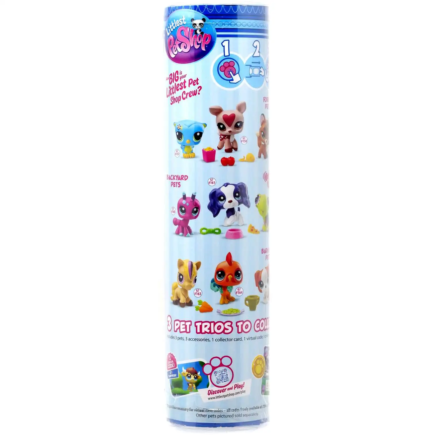 - Each Littlest Pet Shop Pet Trio Blind Tube contains one of three themed setsForest, Barnyard, or Backyardfeaturing three adorable bobbling pets with playful accessories, providing triple the surprise and endless unboxing fun.