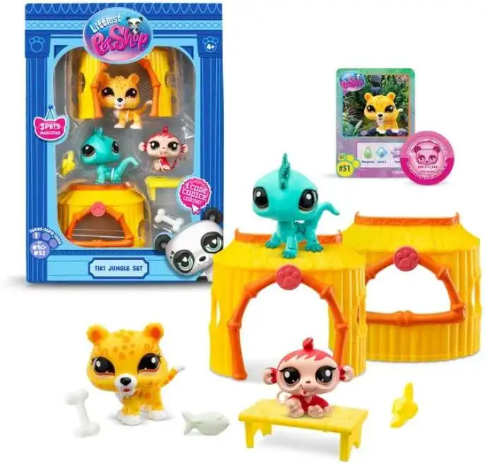Littlest Pet Shop 2024 Generation 7 Tiki Jungle Set Exclusive Mini Figure 3-Pack #50, 51 & 52 [Iguana, Tiger & Monkey, 6 Accessories, Card & Virtual Code]