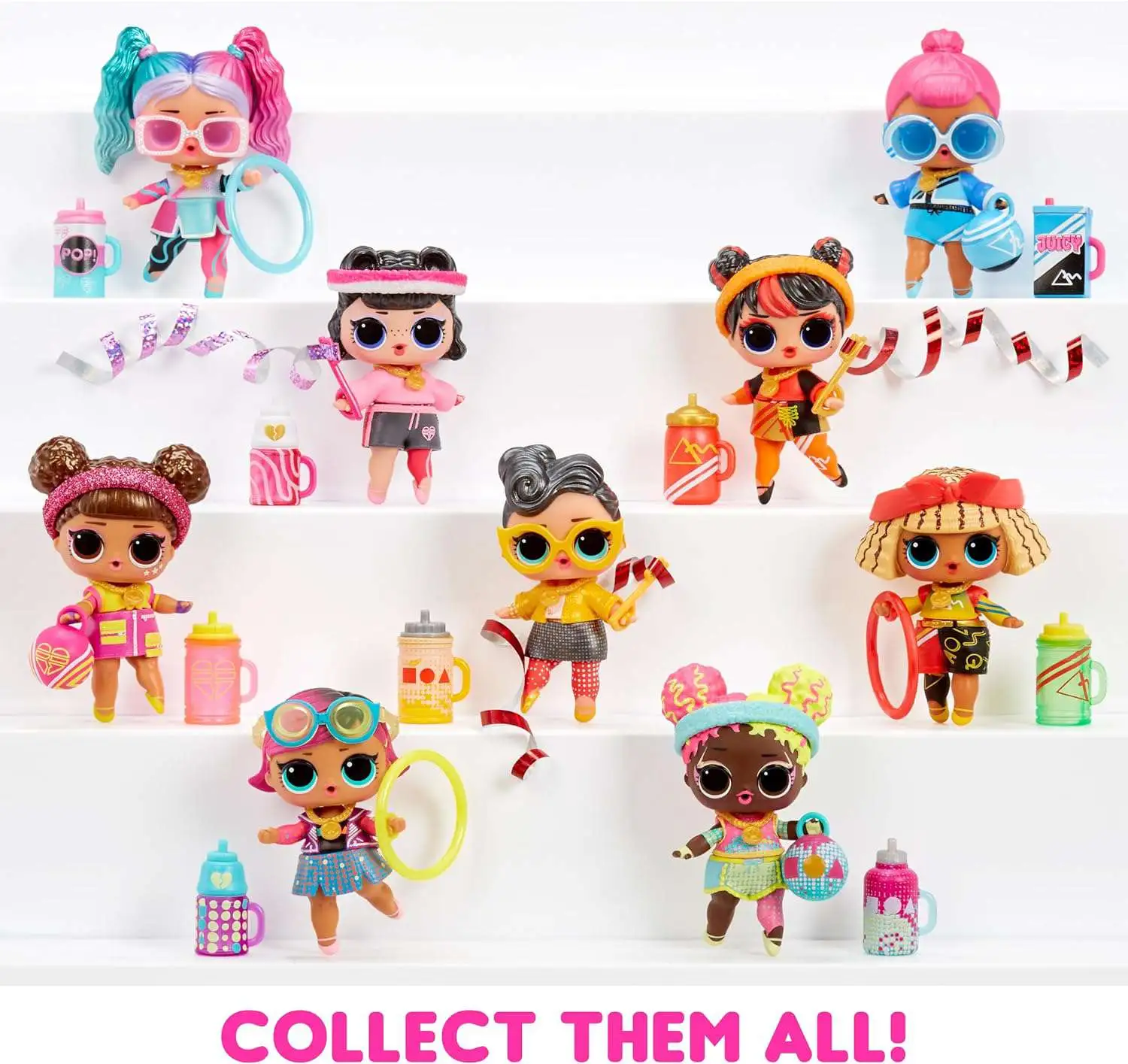 - 8 SURPRISES: (1) L.O.L. Surprise! All Star Sports Gymnastics Doll; (2) Outfit; (3) Bottle; (4) Medal; (5) Shoes; (6) Accessory; (7) Accessory; (8) Exclusive Trading Card